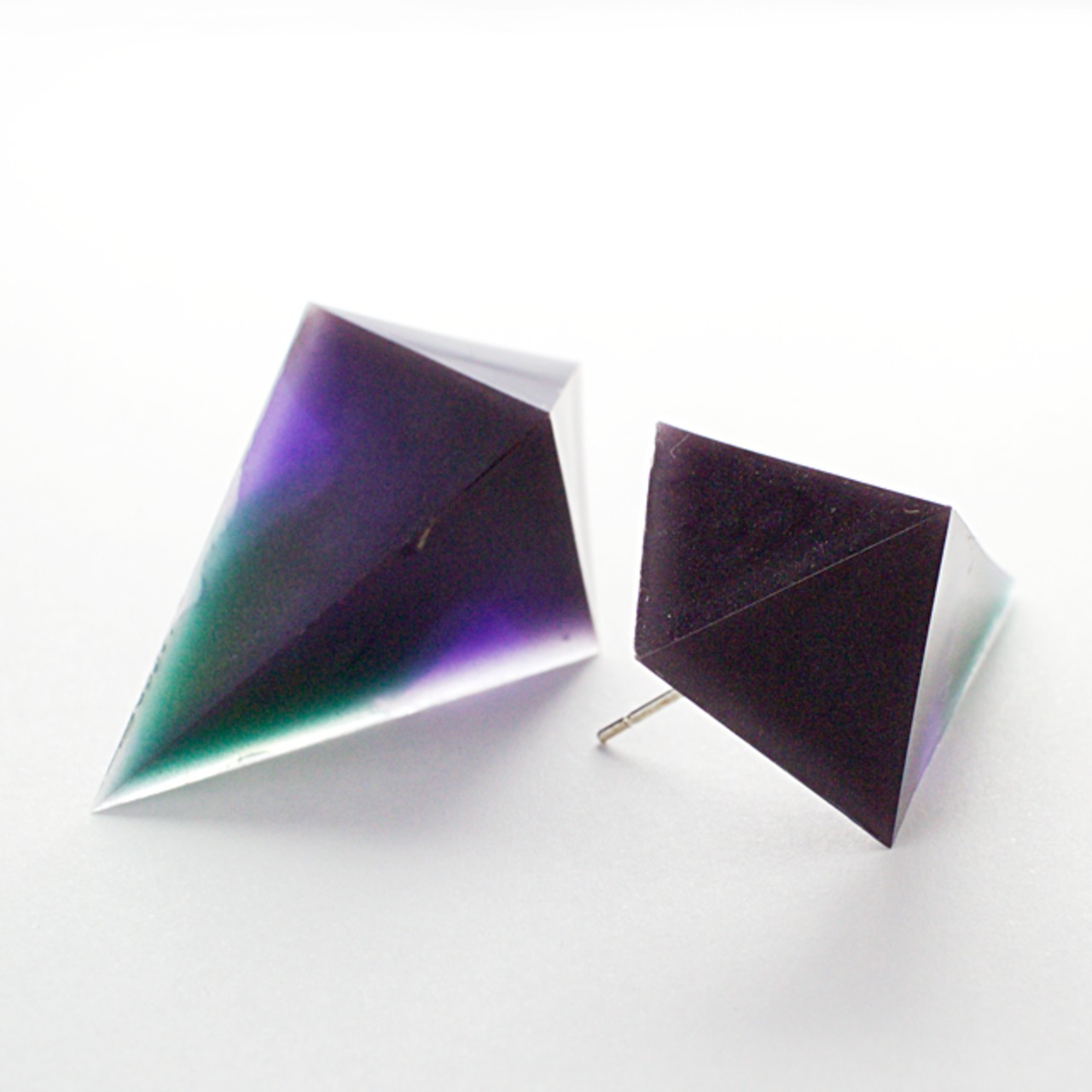 温度で色の変わるカラーとをクリスタルレジンで閉じ込めた鋭角ピラミッドイヤリングです。