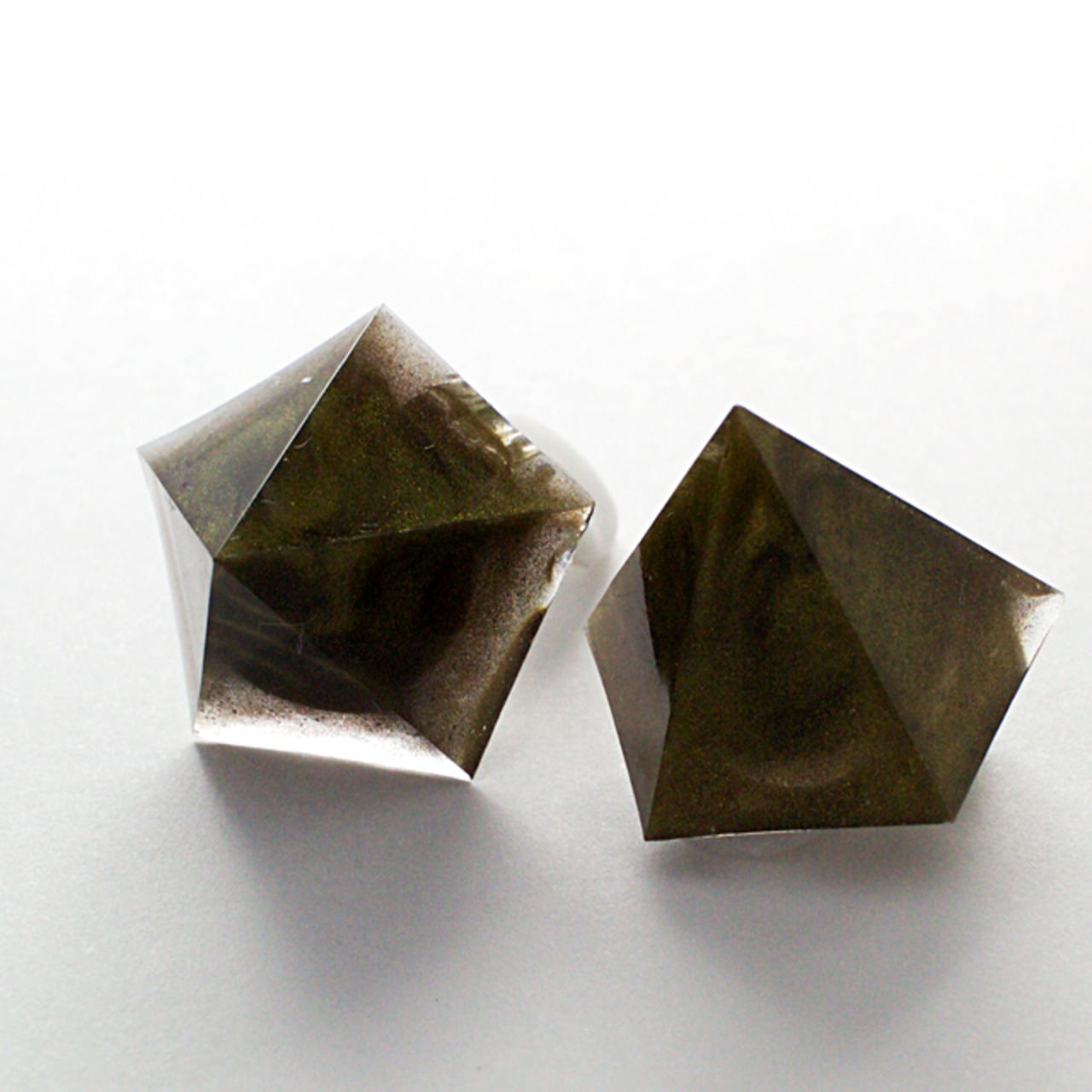 輝くカーキのカラーをクリスタルレジンで閉じ込めたペンタゴン型のイヤリングです。