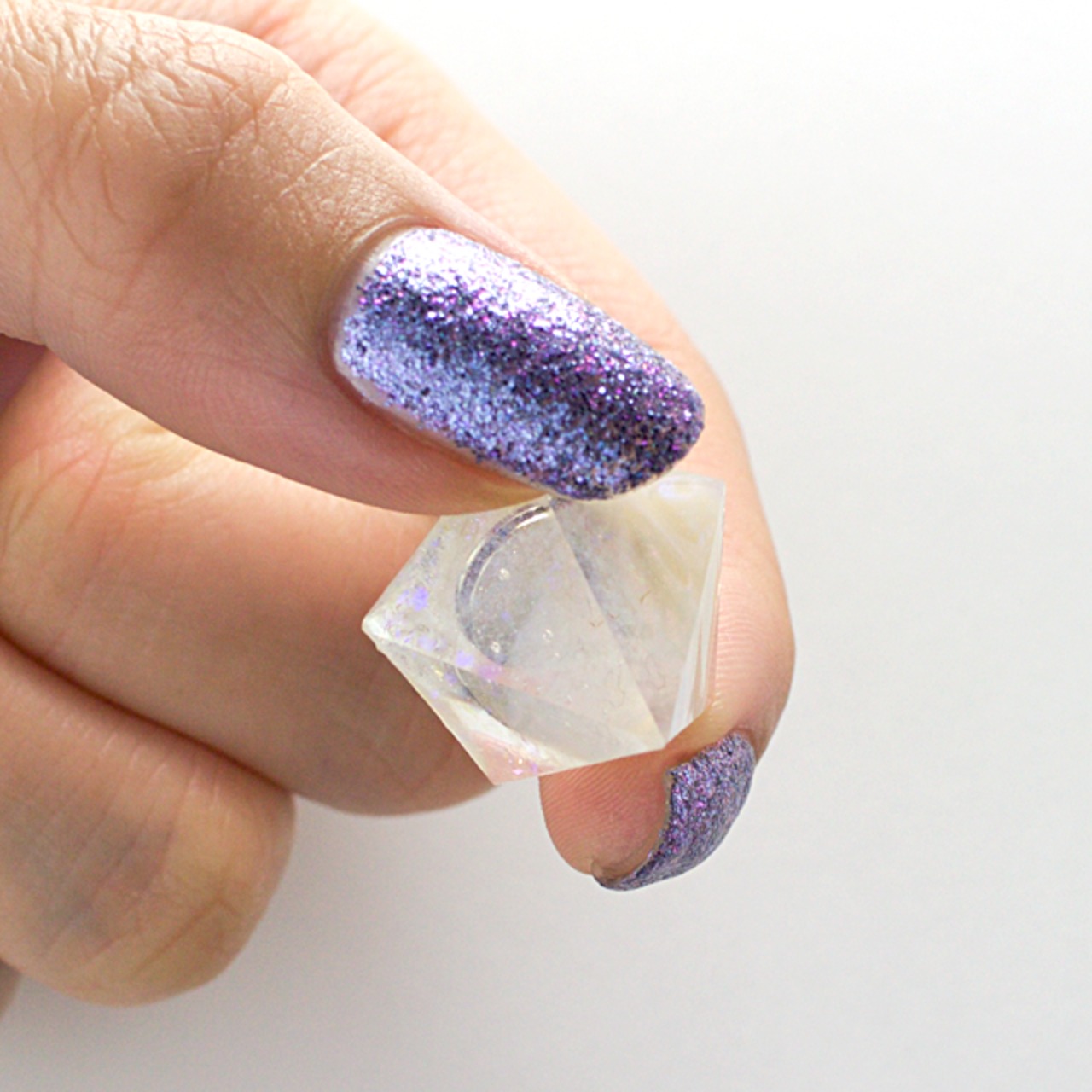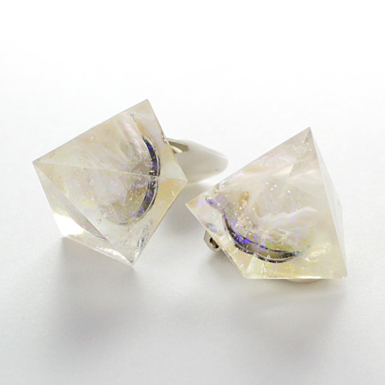 ホワイト、偏光ホワイトのカラーなどをクリスタルレジンで閉じ込めたペンタゴン型のイヤリングです。