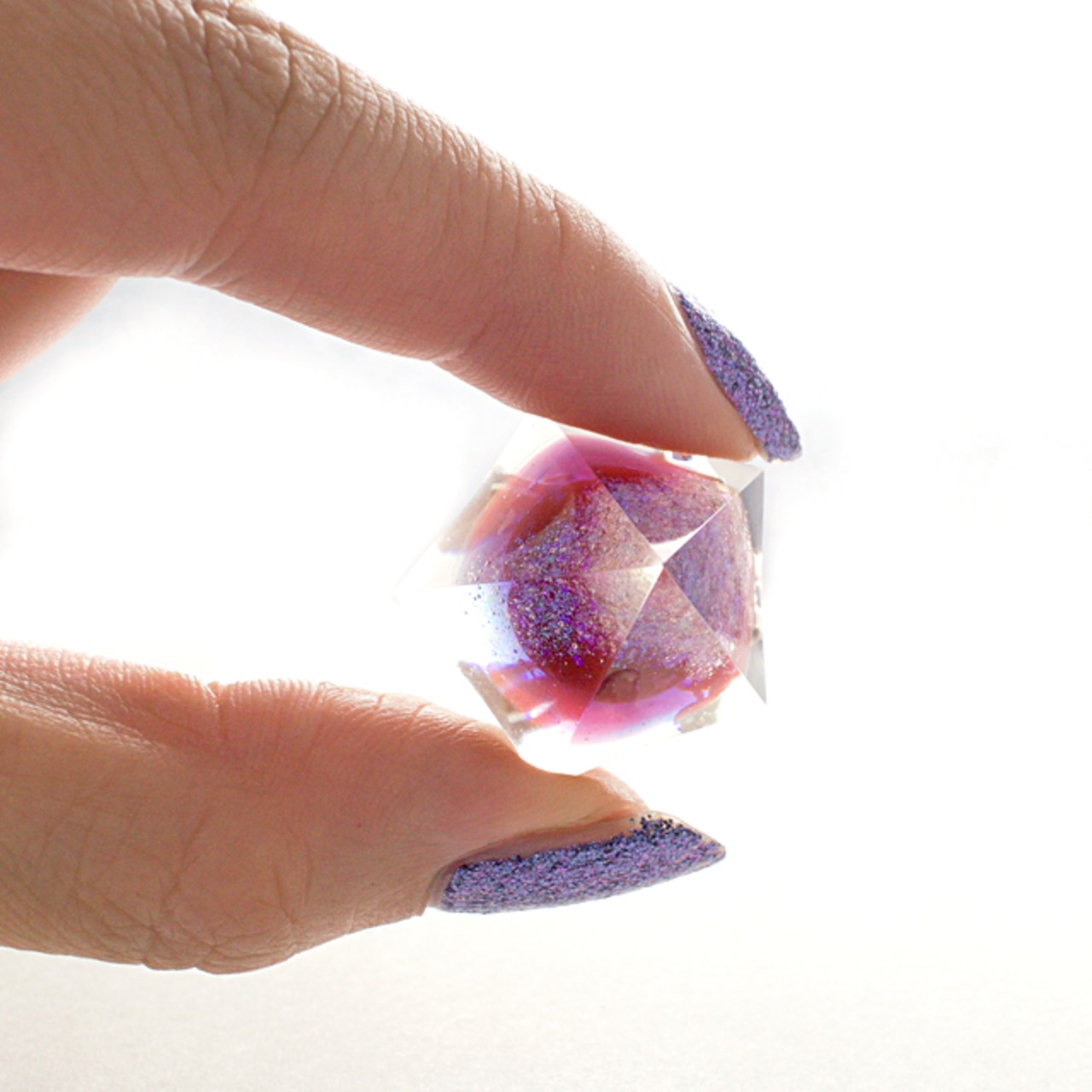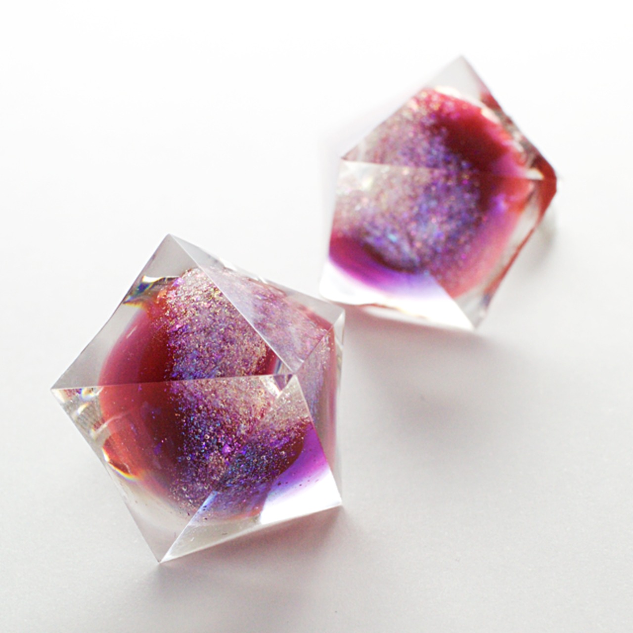 ドーム型にレッドカラーや偏光ラメなどをクリスタルレジンで閉じ込めたペンタゴン型のイヤリングです。