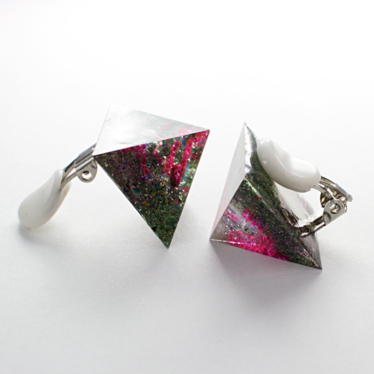 ピンクブリオンとグリーンを中心とした数種類のラメなどをクリスタルレジンで閉じ込めたイヤリングです。