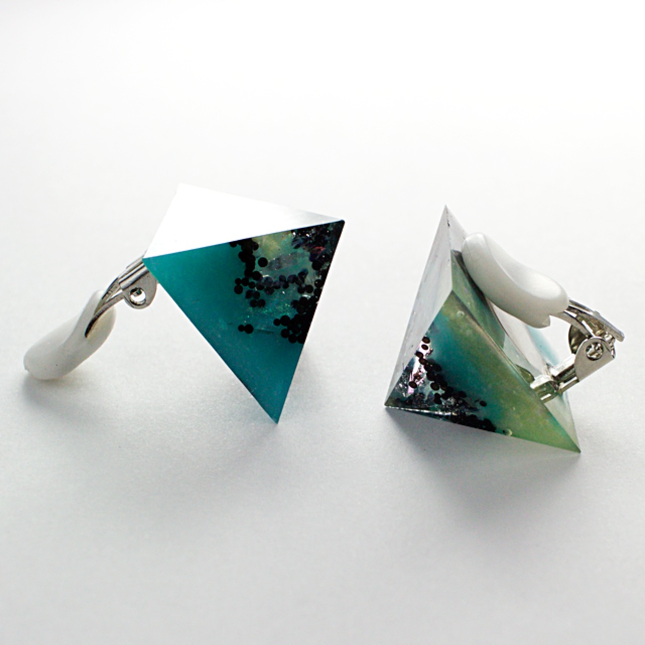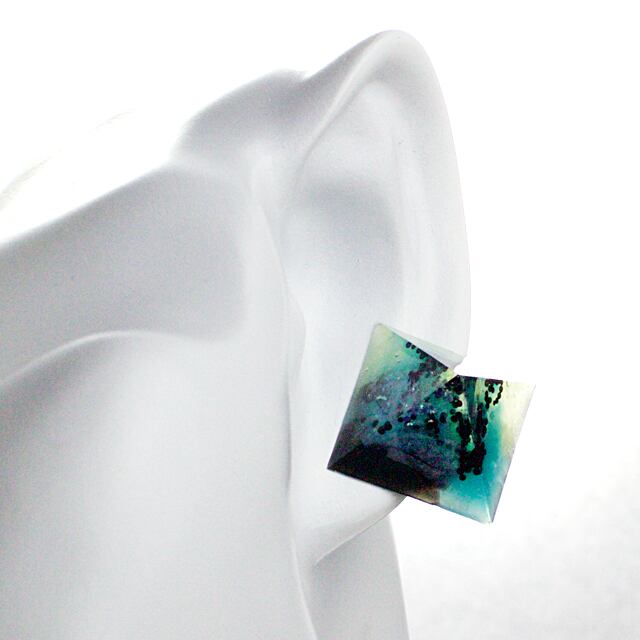 ブラックブリオン、ブルーとゴールドとブラックカラーに偏光ラメなどをクリスタルレジンで閉じ込めたイヤリングです。