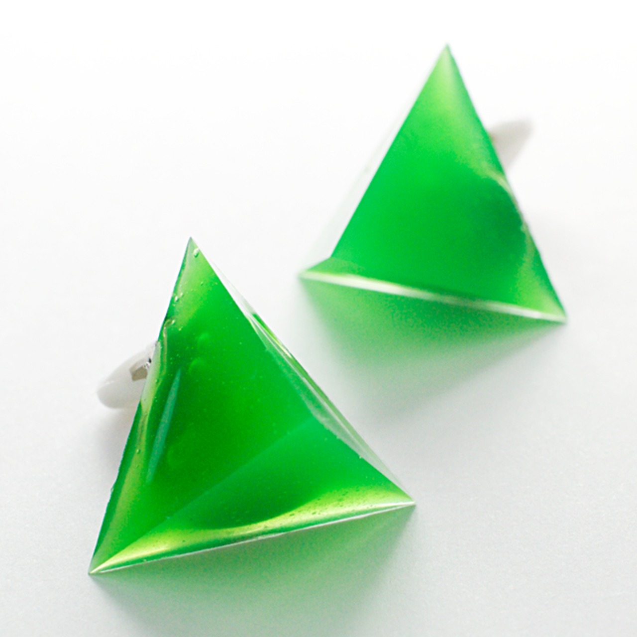 蓄光カラーとグリーンカラーをクリスタルレジンで閉じ込めた三角錐型のクリップタイプのイヤリングです。