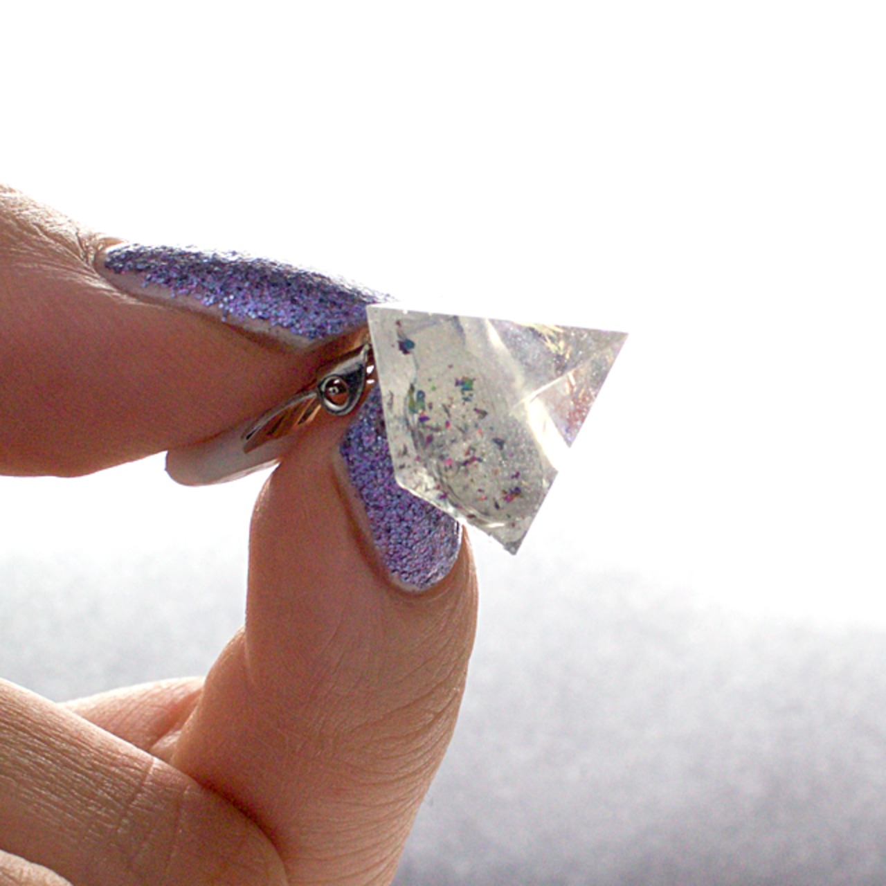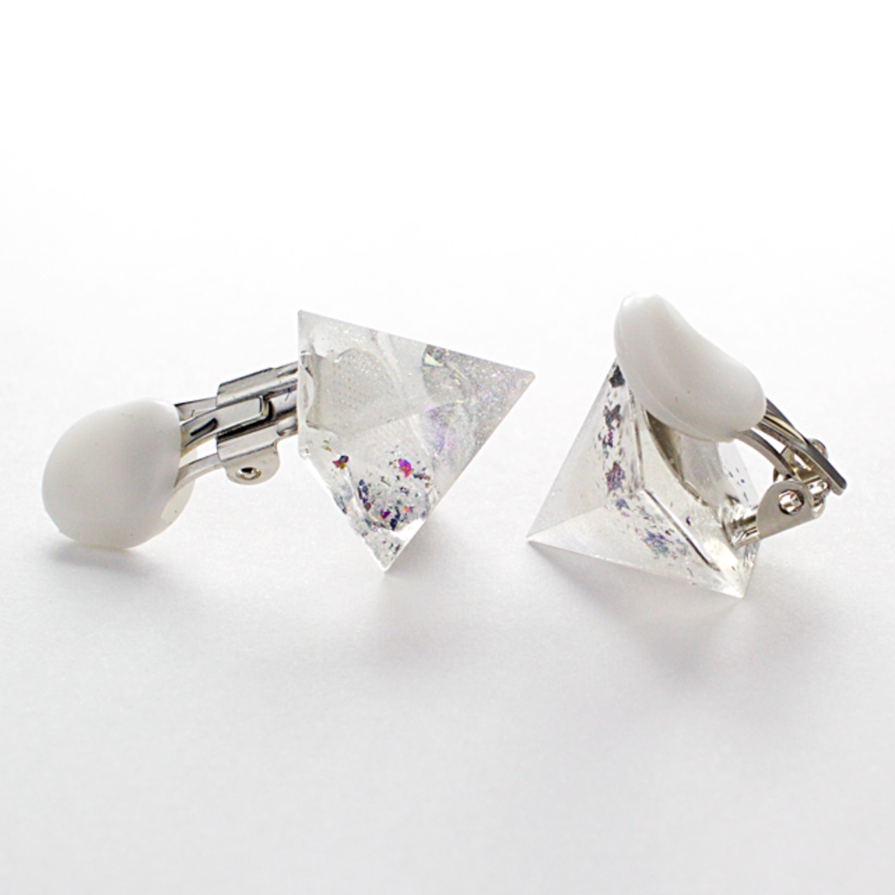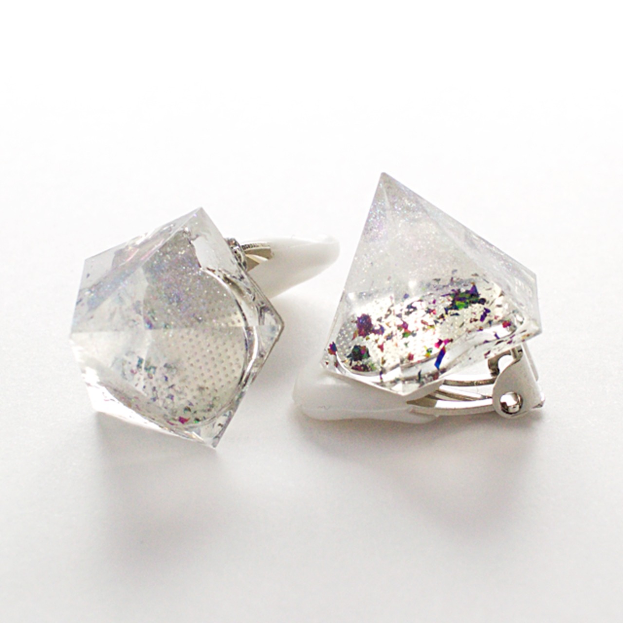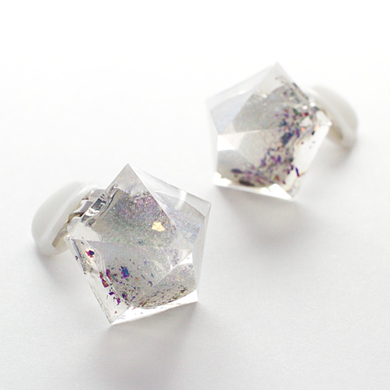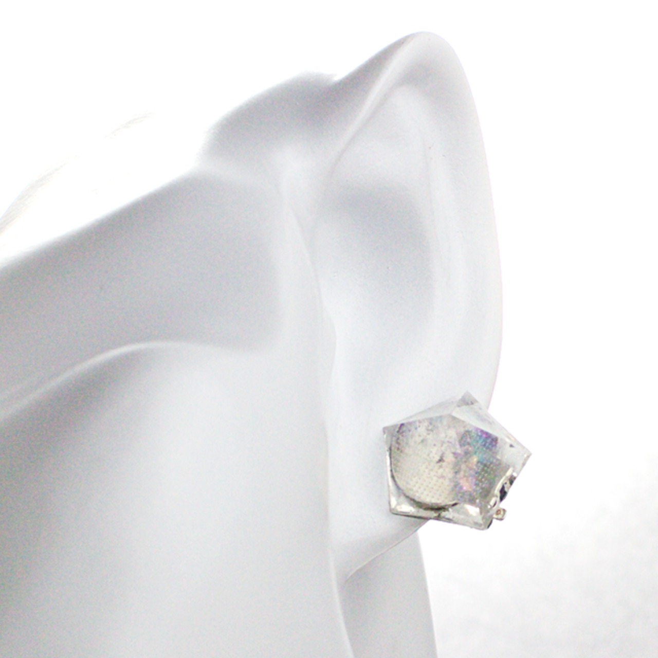 クリアカラーに数種類の偏光ラメをクリスタルレジンで閉じ込めたペンタゴン型のイヤリングです。