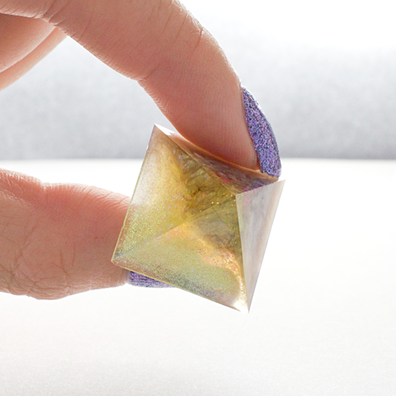 イエローとシルバーカラー、ブリオンと自作パーツなどをクリスタルレジンで閉じ込めたピラミッド型のピアスです