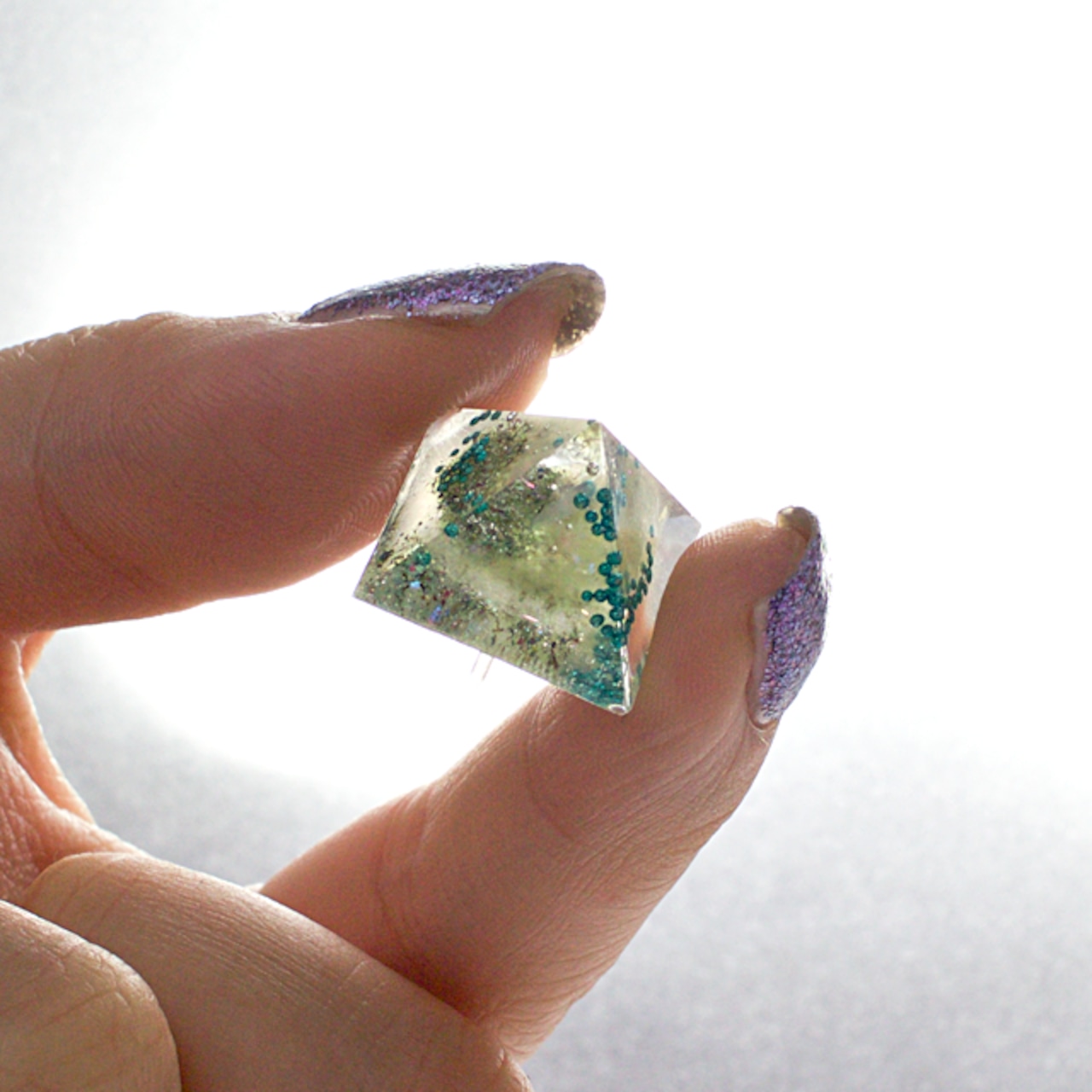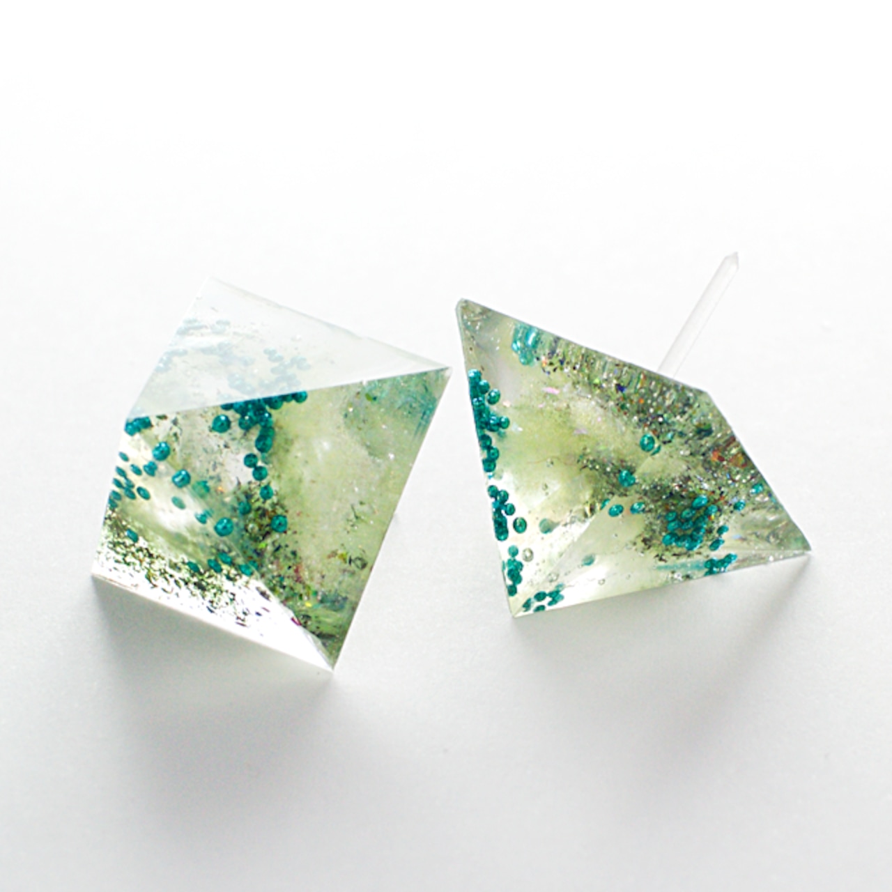ラメと自作パーツとブリオンなどをクリスタルレジンで閉じ込めたピラミッド型のピアスです