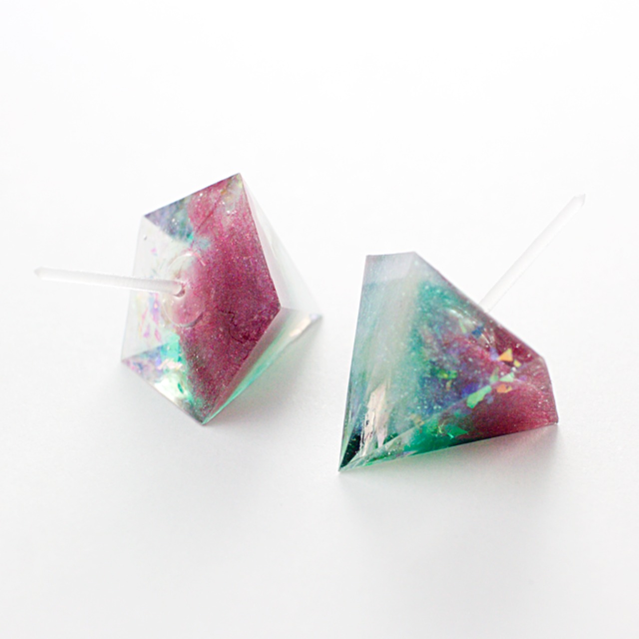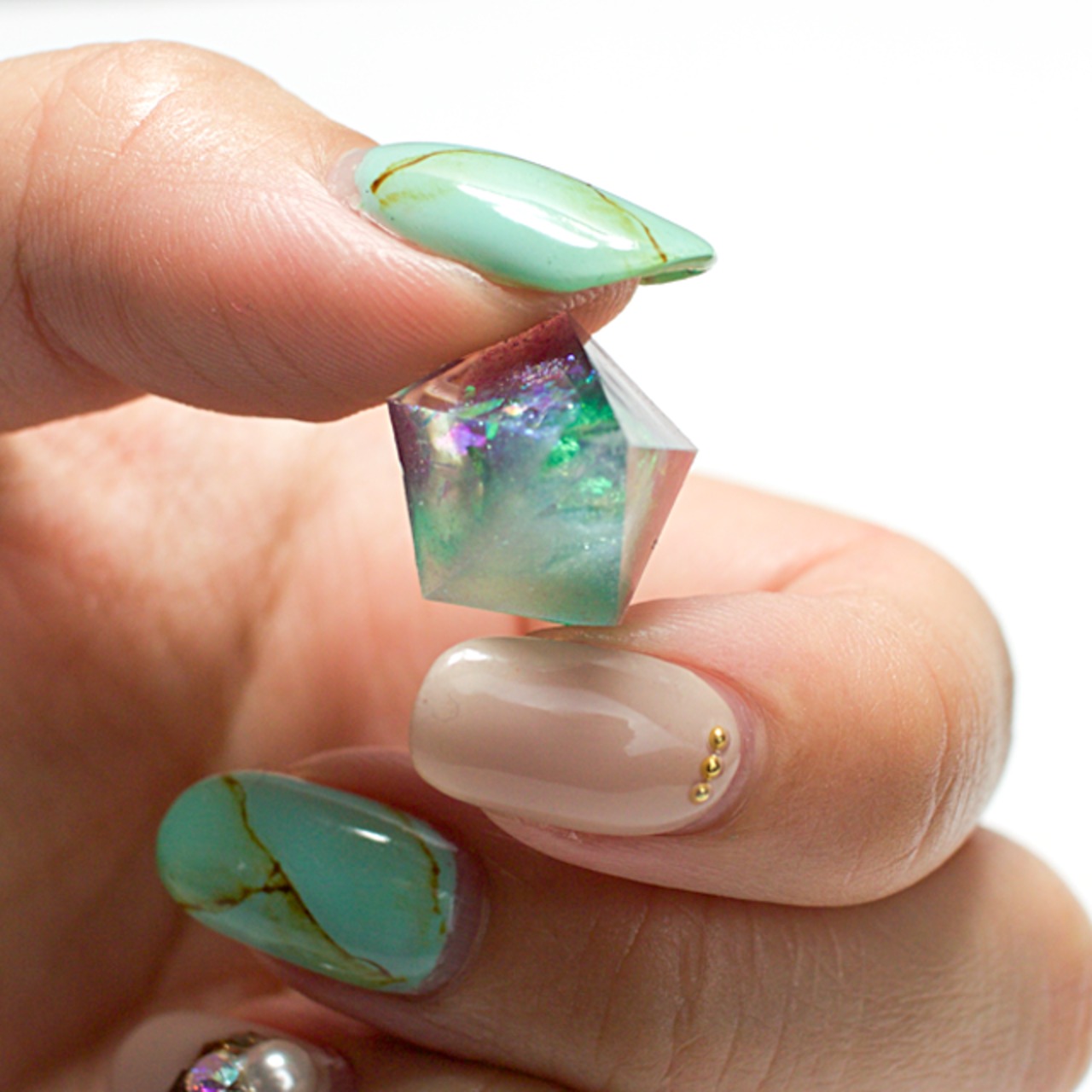 グリーンのシェルと自作オーロラパーツとラメや顔料などをクリスタルレジンで閉じ込めたペンタゴン型のピアスです。