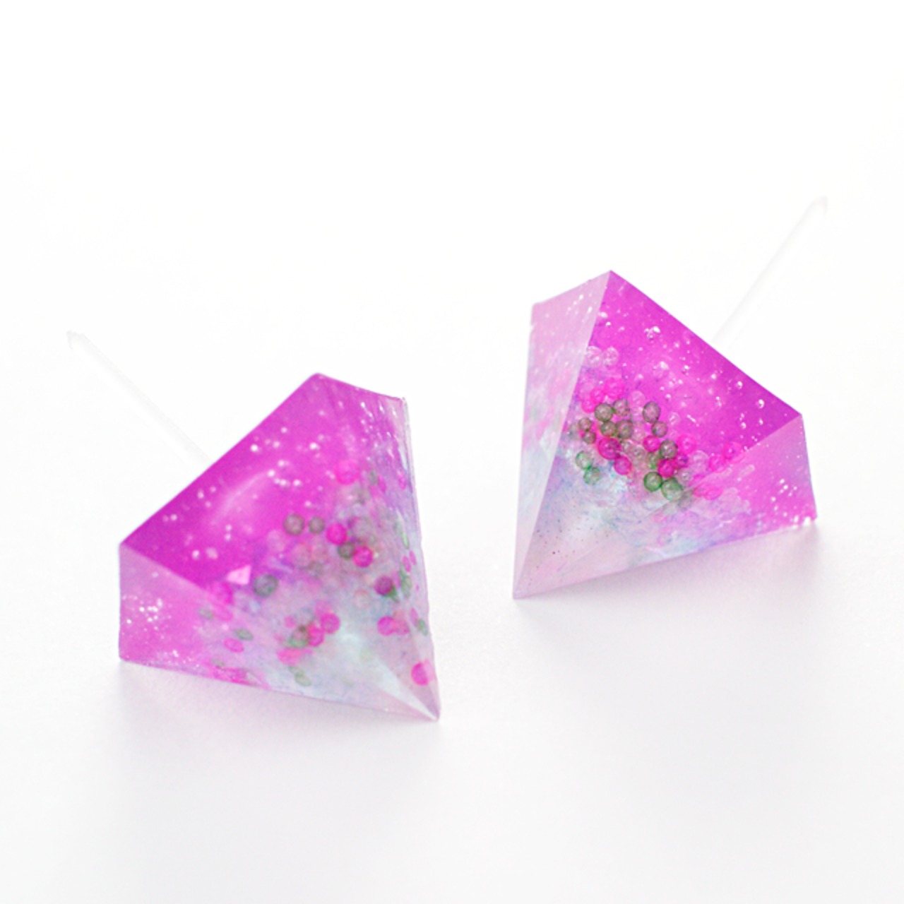 フューシャピンクを中心とした顔料、自作オーロラパーツや偏光ラメや3色のブリオンなどをクリスタルレジンで閉じ込めたペンタゴン型のピアスです。