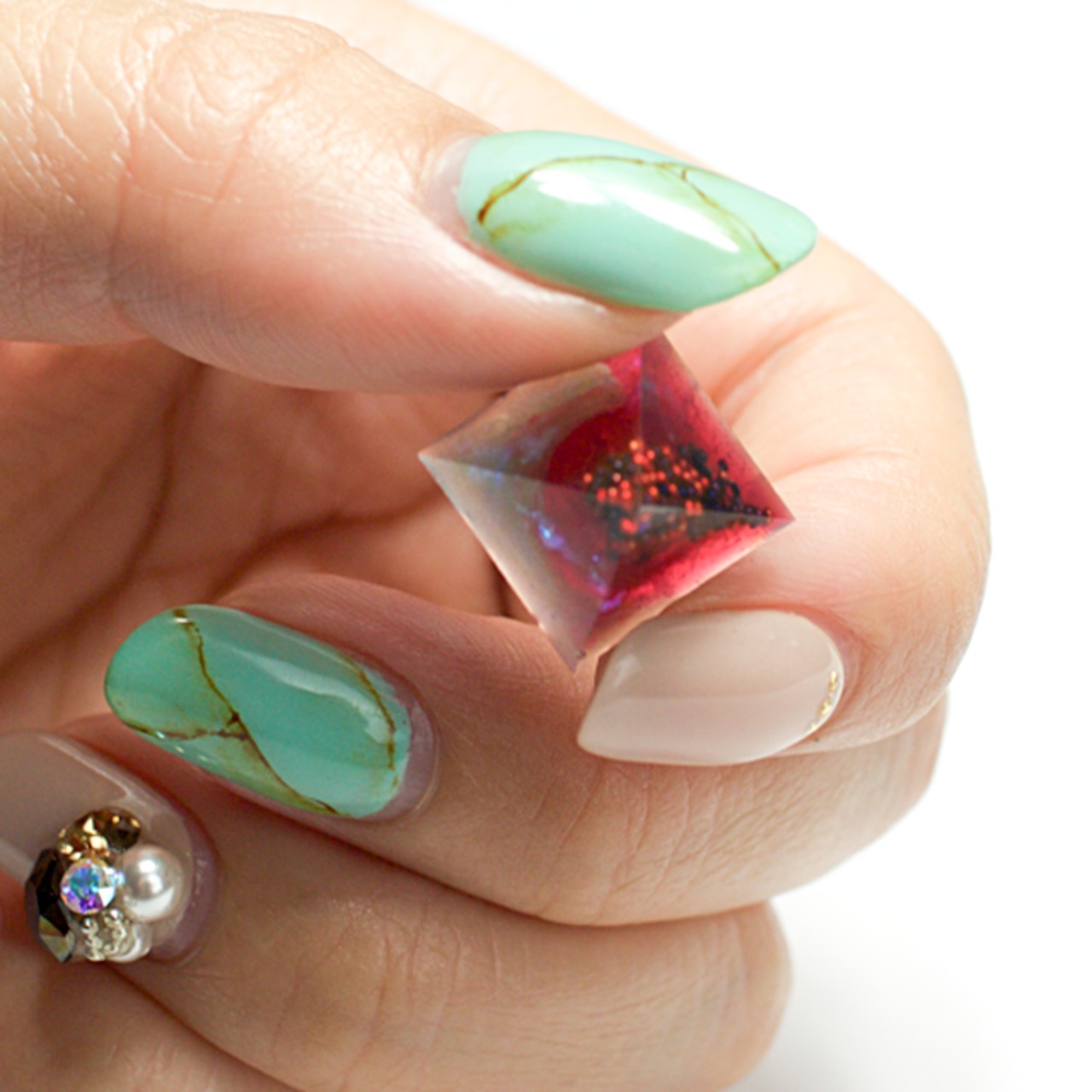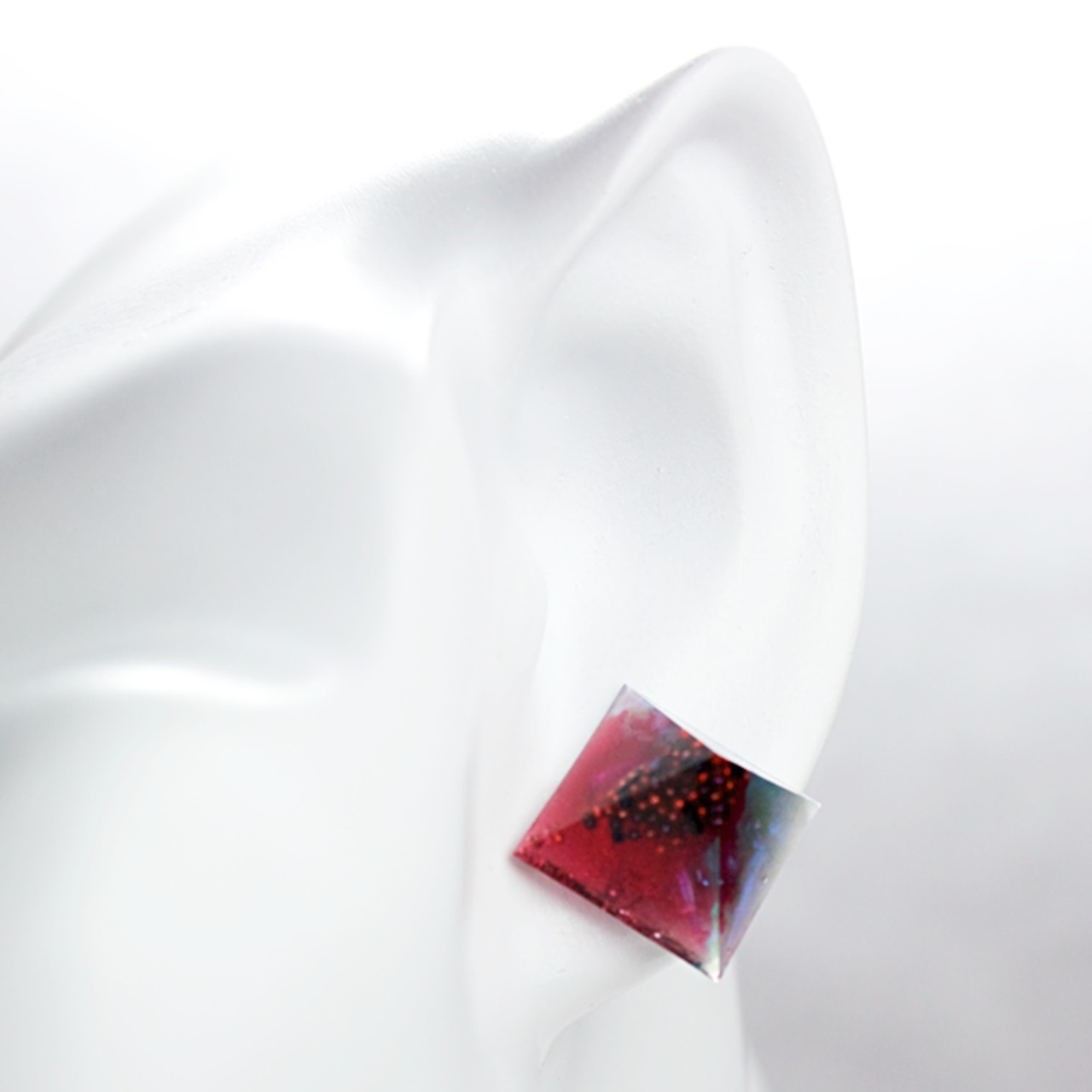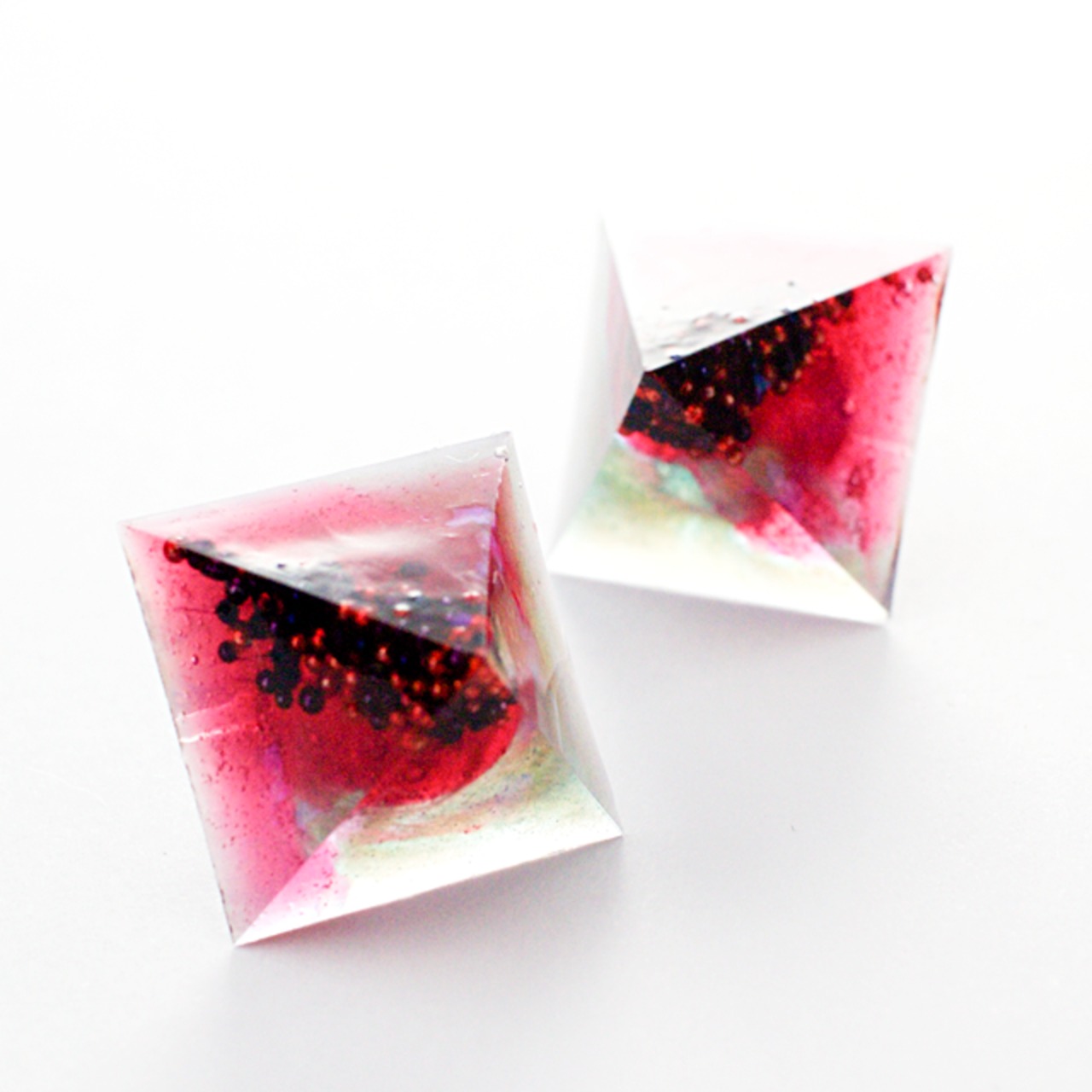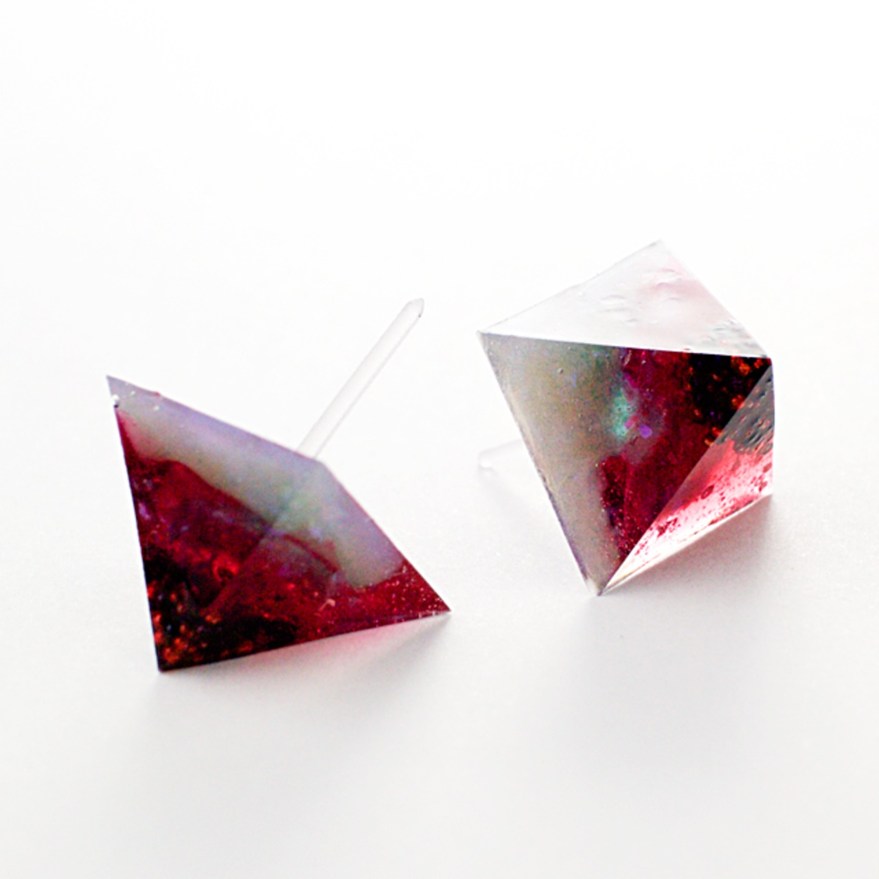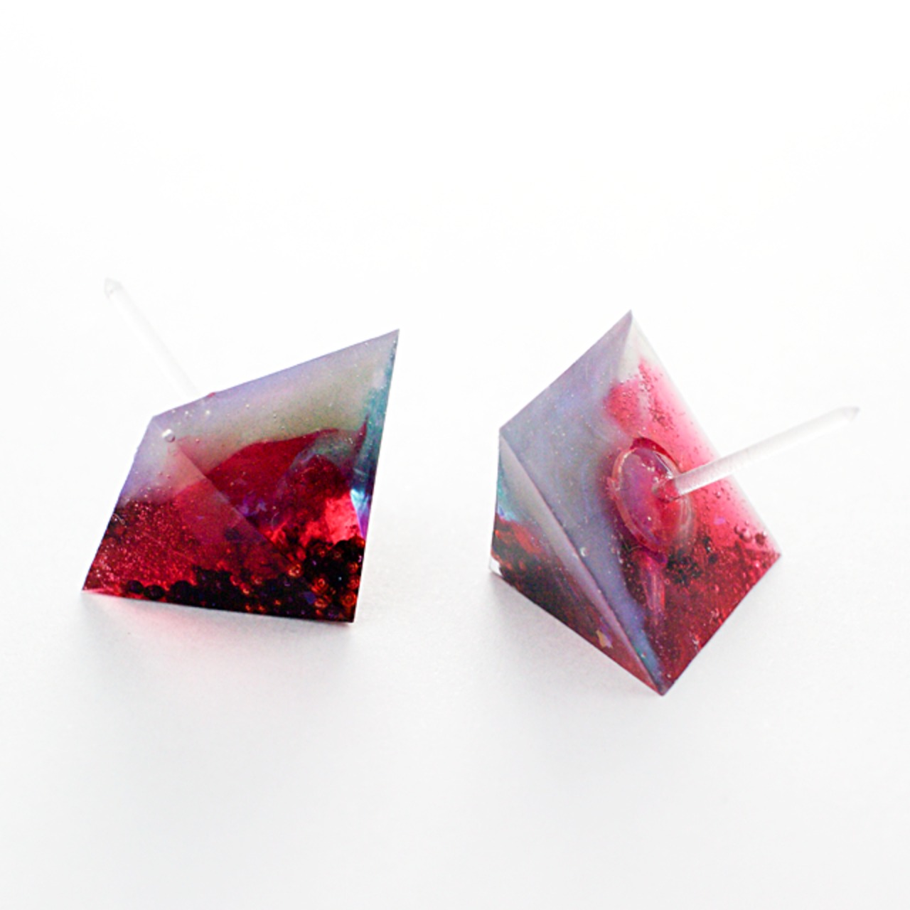 レッド、偏光ブルーの顔料と3色のブリオン、自作オーロラパーツ、ラメなどを閉じ込めたクリスタルレジンのピラミッド型のピアスです。