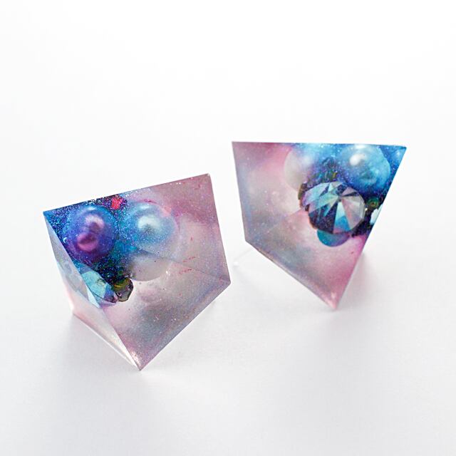 様々なビジューやパールストーン、先端にブルーと下部にピンクカラーなどをクリスタルレジンで閉じ込めたペンタゴン型のピアスです。
