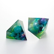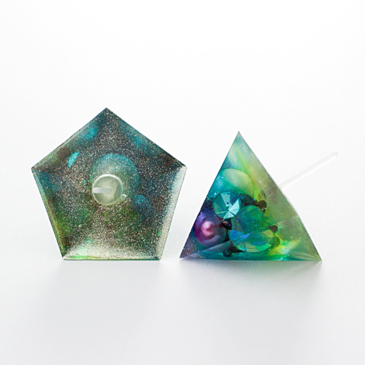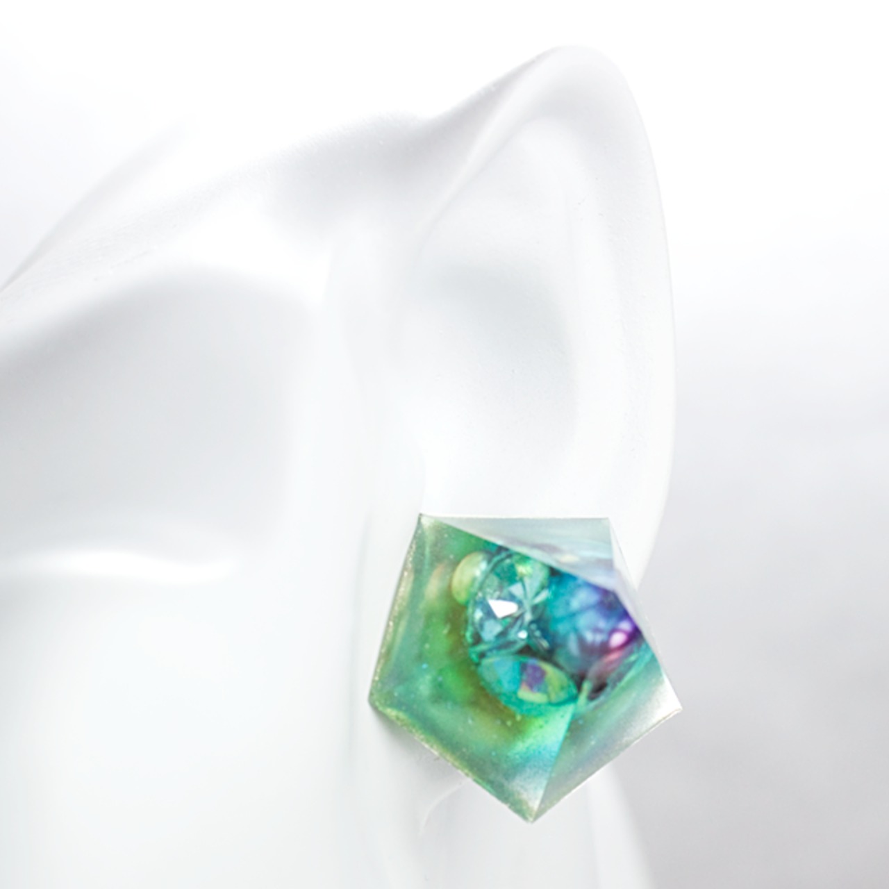 様々なビジューやパールストーン、先端にブルーと下部にイエローカラーなどをクリスタルレジンで閉じ込めたペンタゴン型のピアスです。