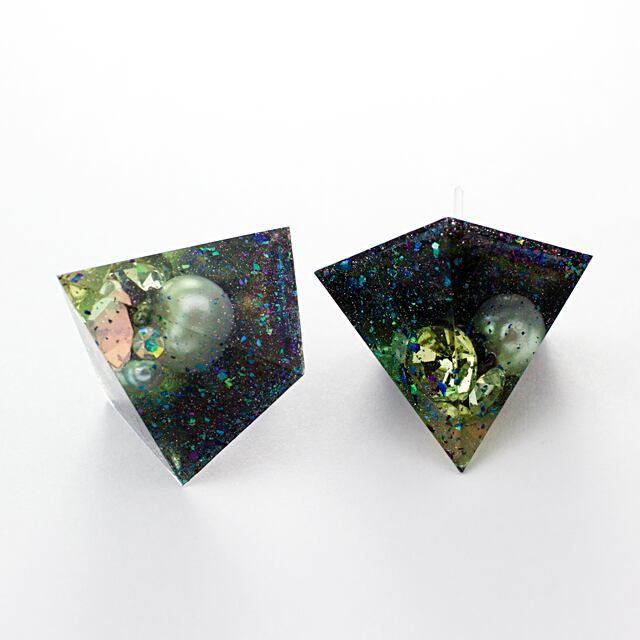 様々なビジューやパールストーン、イエローのカラーなどをクリスタルレジンで閉じ込めたペンタゴン型のピアスです。