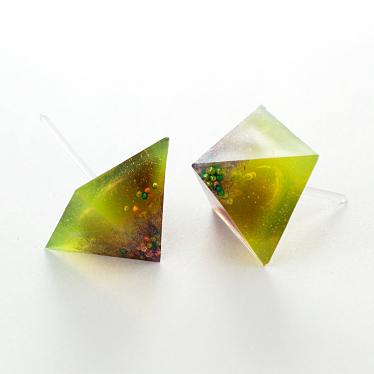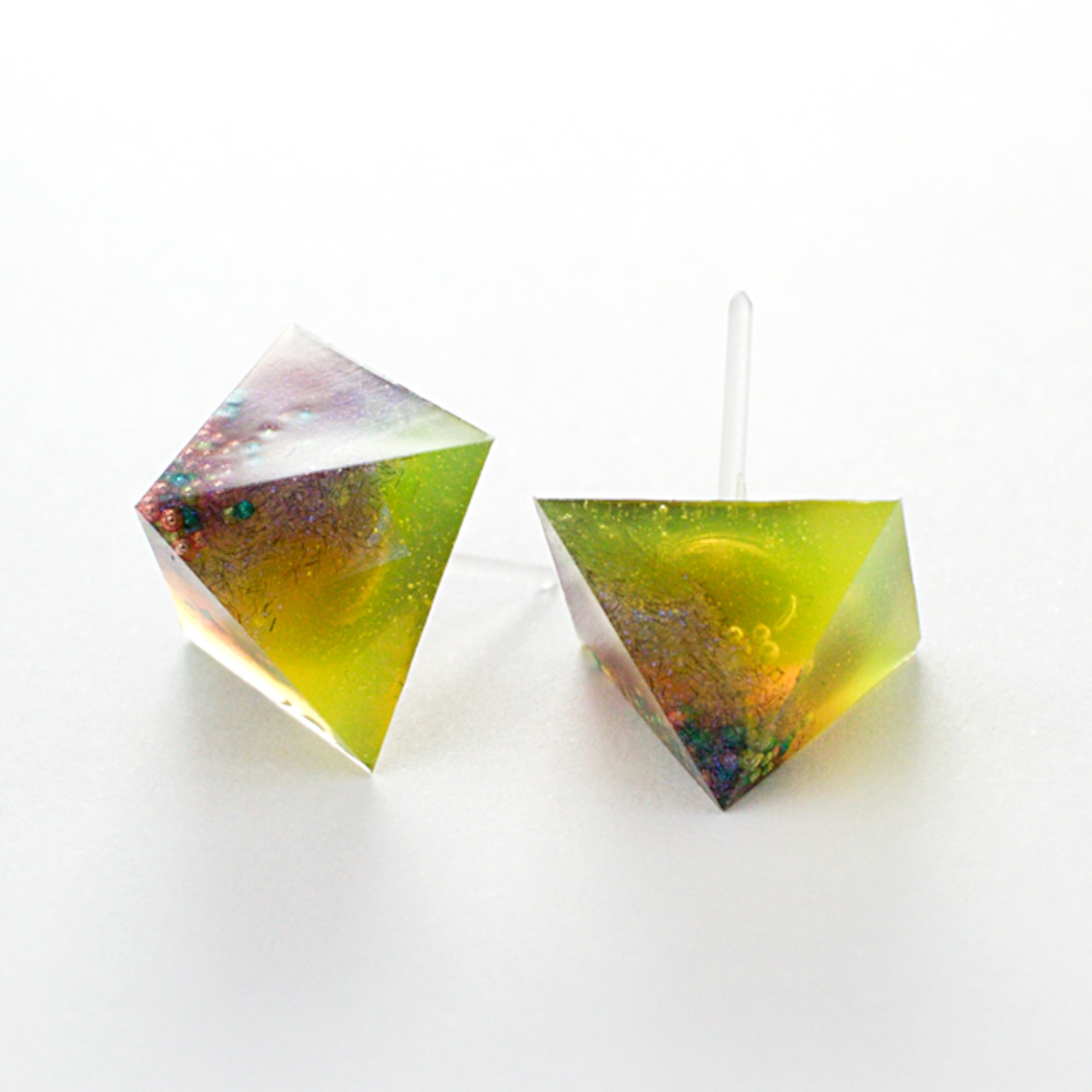イエローカラーとブラウンを中心にブリオンや偏光パウダーなどをクリスタルレジンで閉じ込めたピラミッド型のピアスです