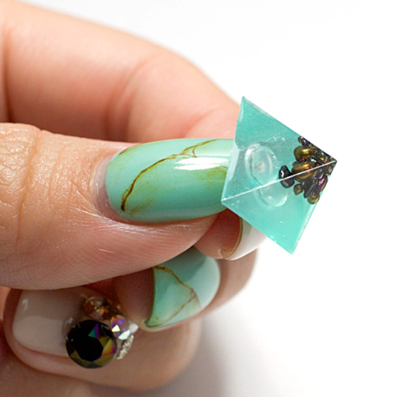 ライトブルーと小さなストーンをクリスタルレジンで閉じ込めたピラミッド型のピアスです