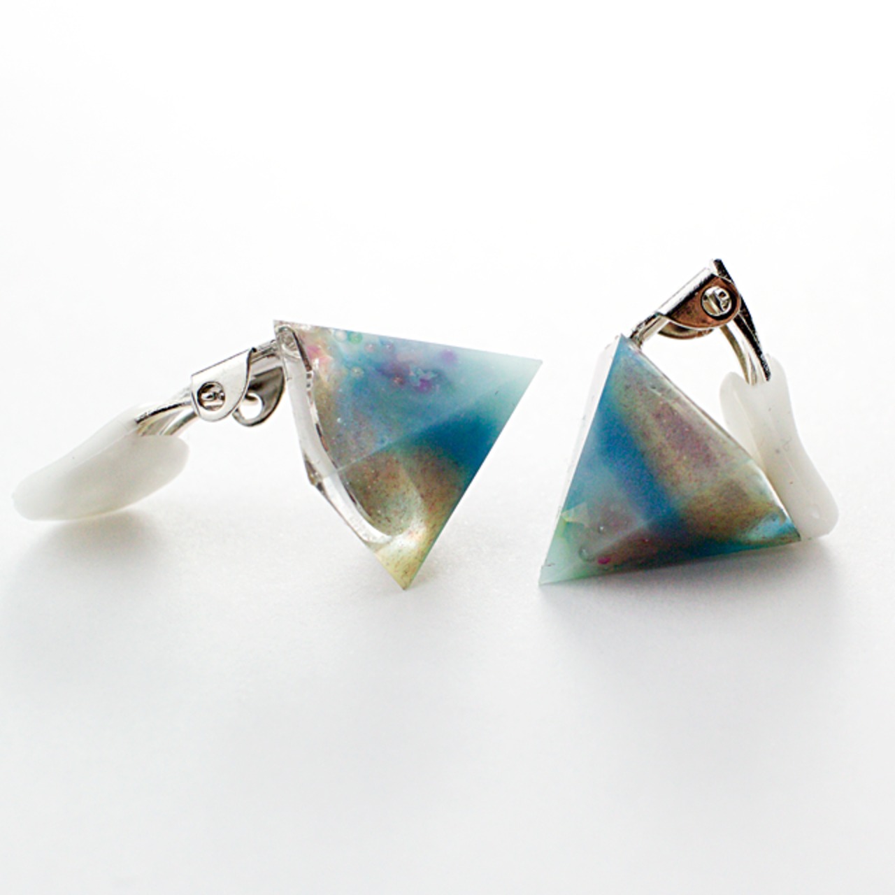 ライトブルー、ブルー、ピンクのブリオンやシェルなどをクリスタルレジンで閉じ込めたペンタゴン型のイヤリングです。