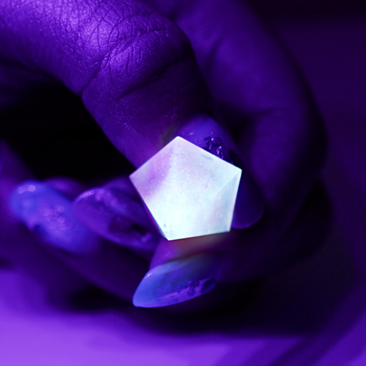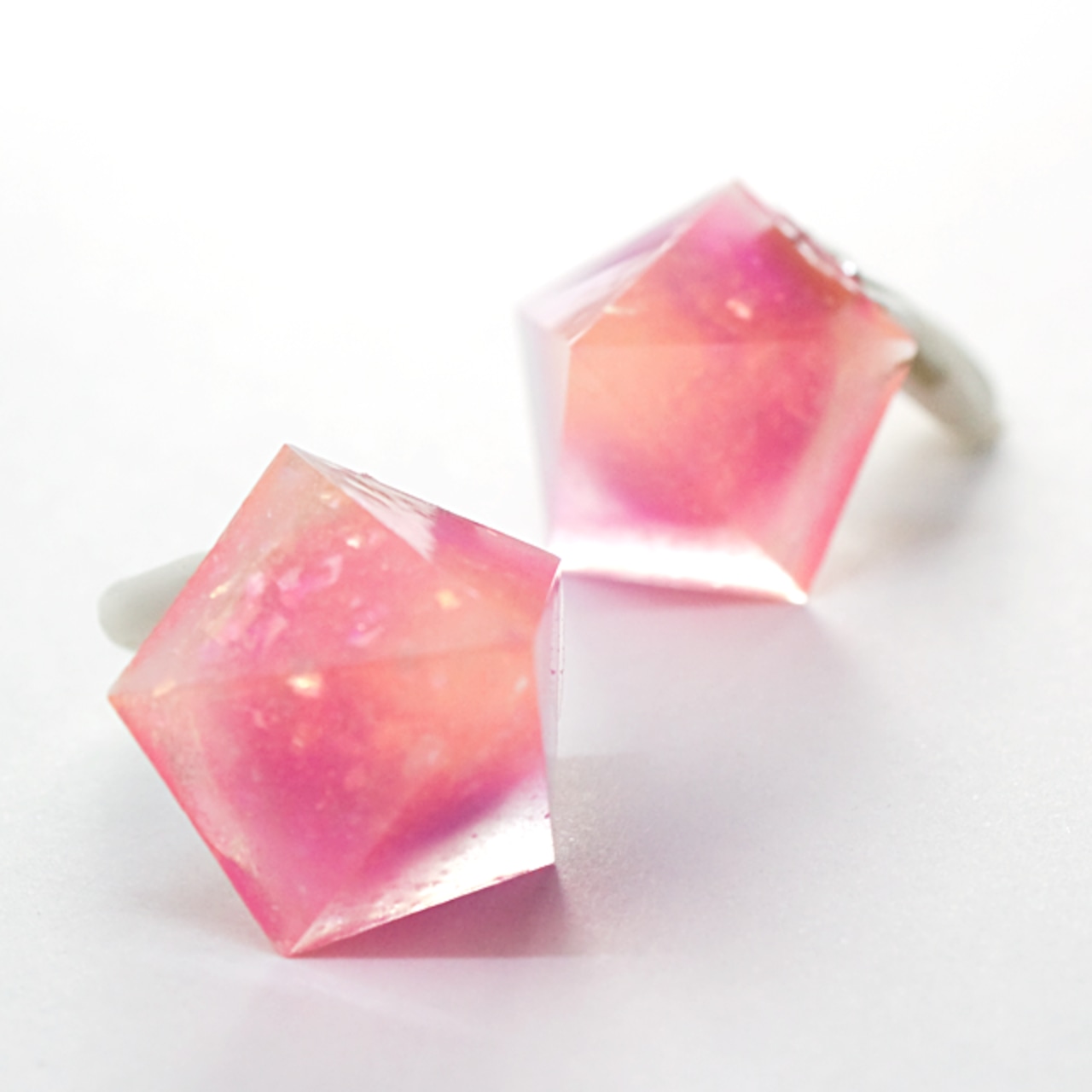 蓄光のピンクカラーを中心にラメなどをクリスタルレジンで閉じ込めたペンタゴン型のイヤリングです。