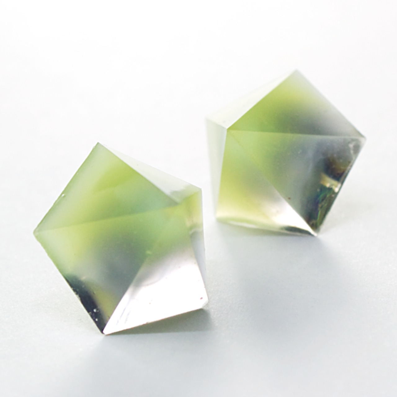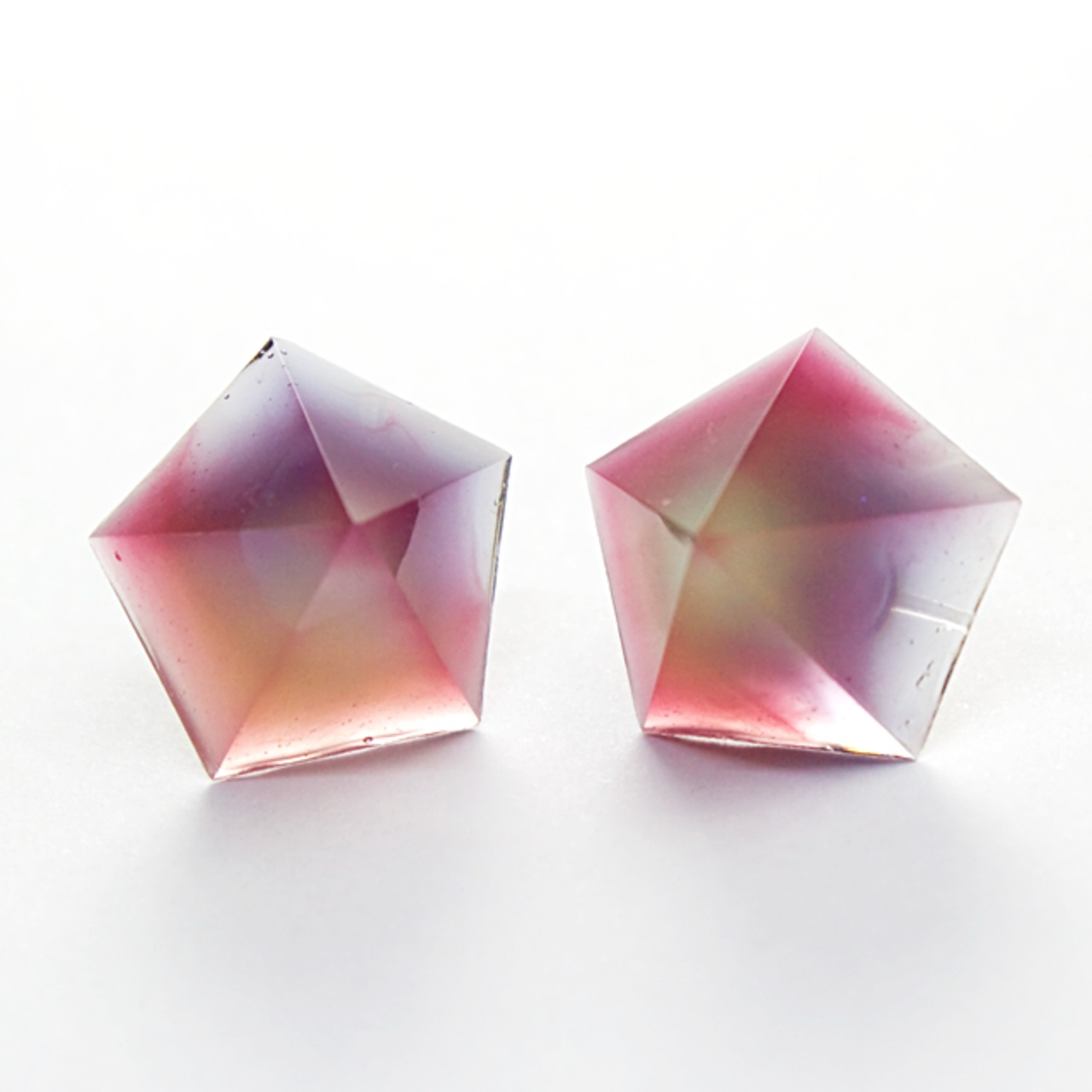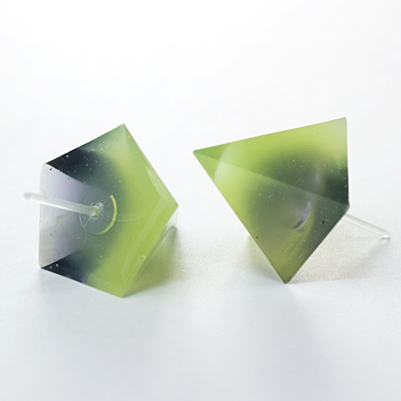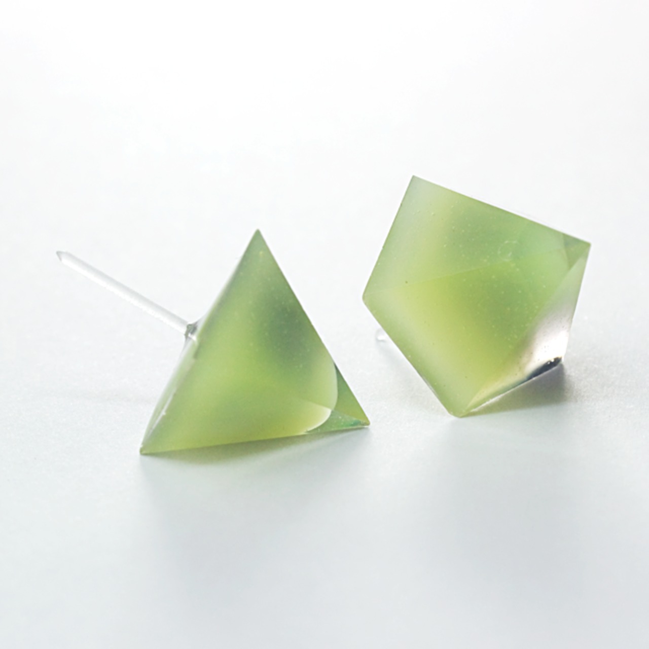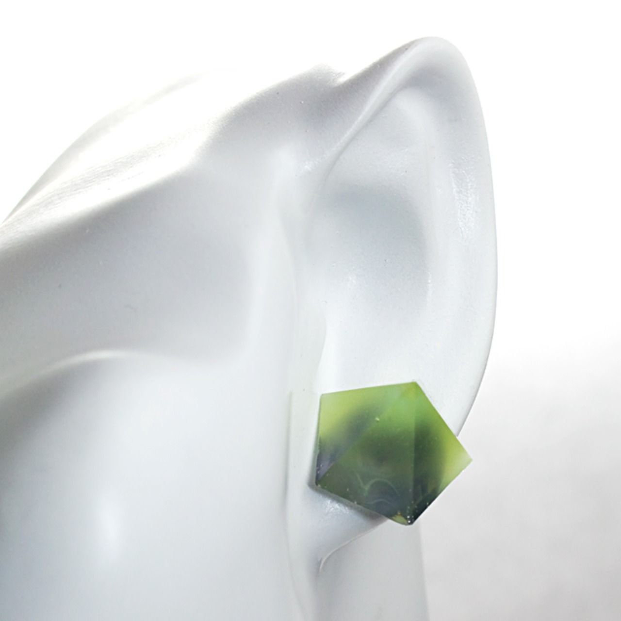 紫外線で変色するイエロー二色とダークブルーのカラーなどをクリスタルレジンで閉じ込めたペンタゴン型のピアスです。