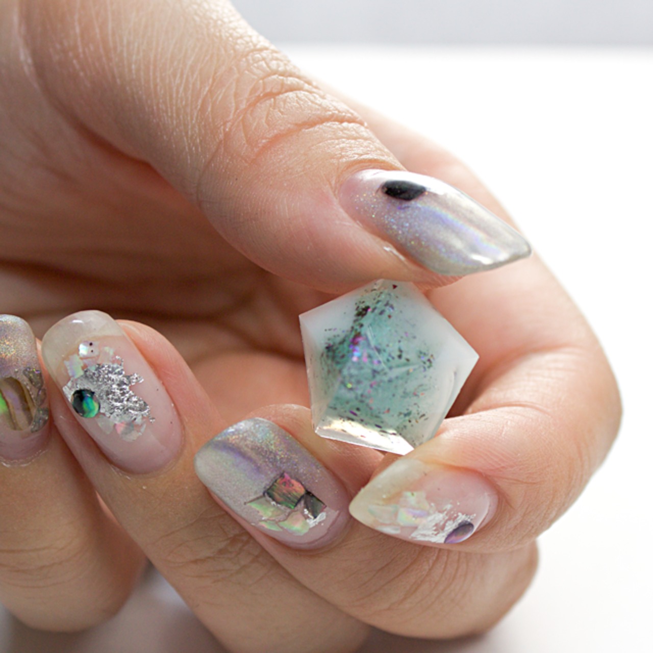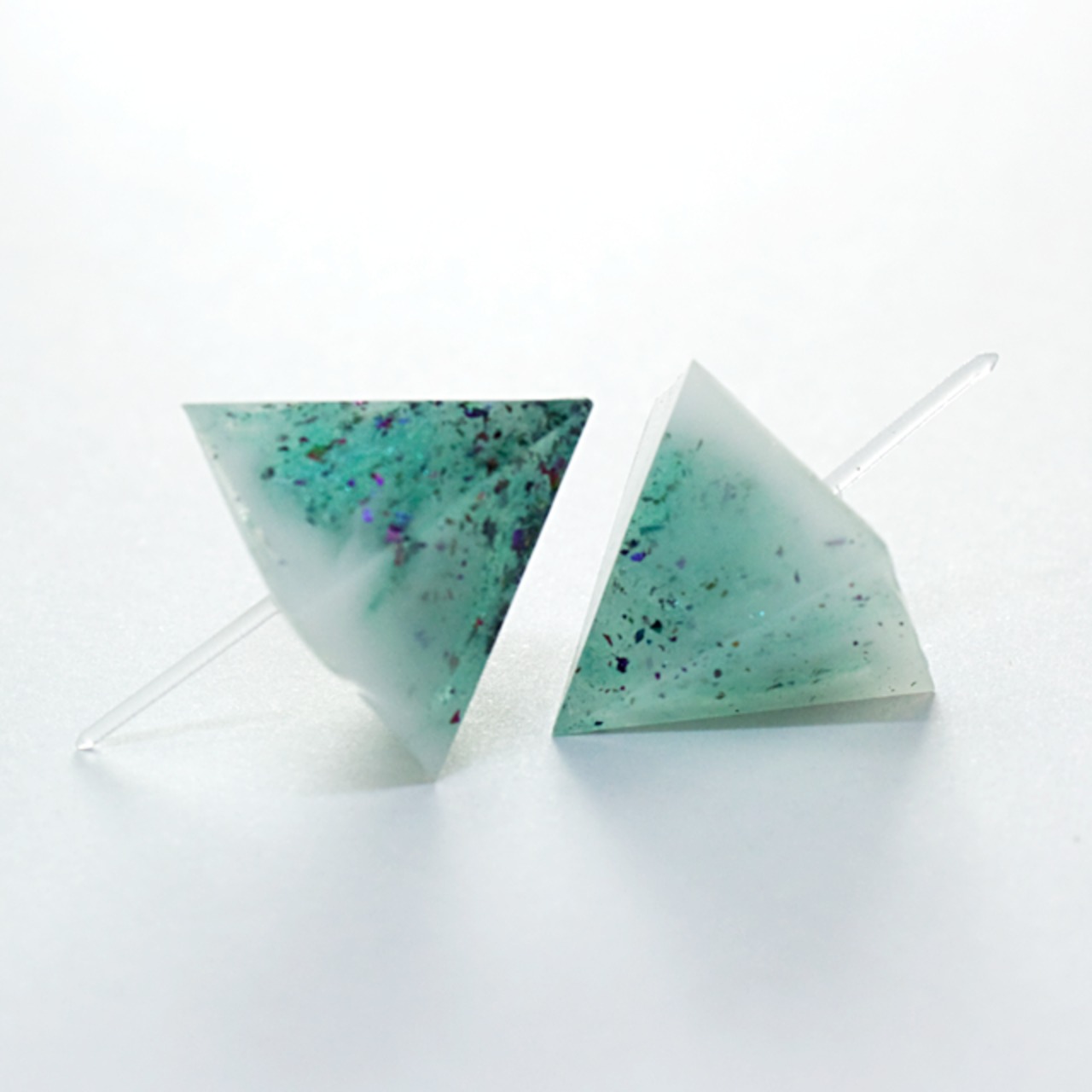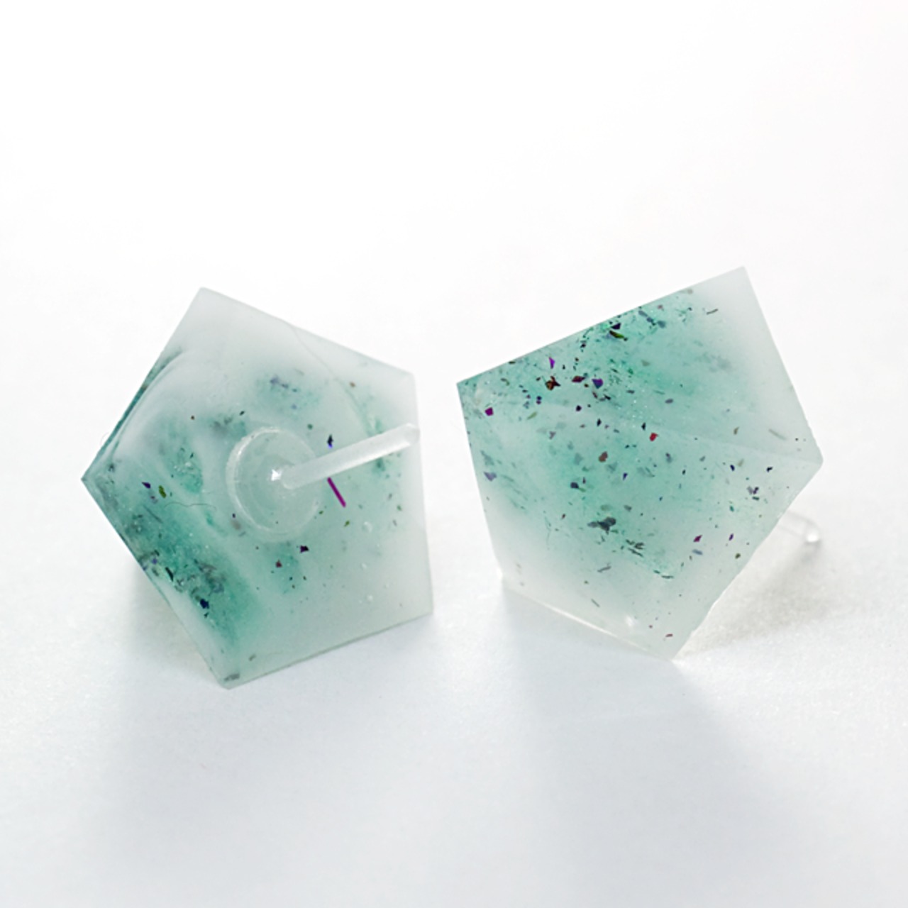 ホワイトやライトブルーのカラーや、数種類のラメなどをクリスタルレジンで閉じ込めたペンタゴン型のピアスです。