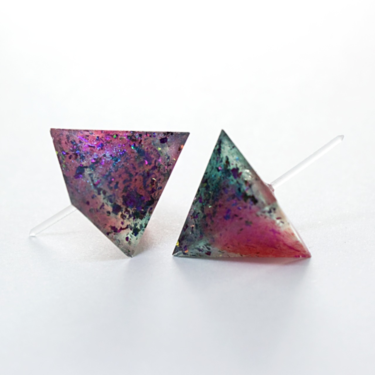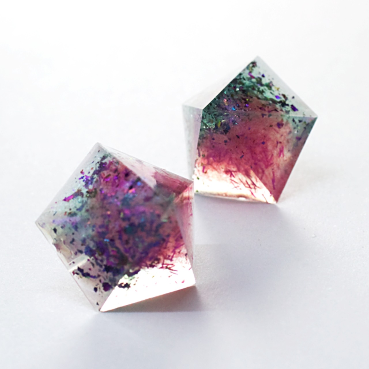 ピンクやブルーグリーンのカラーや、数種類のラメなどをクリスタルレジンで閉じ込めたペンタゴン型のピアスです。