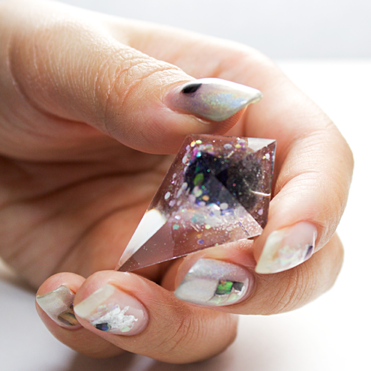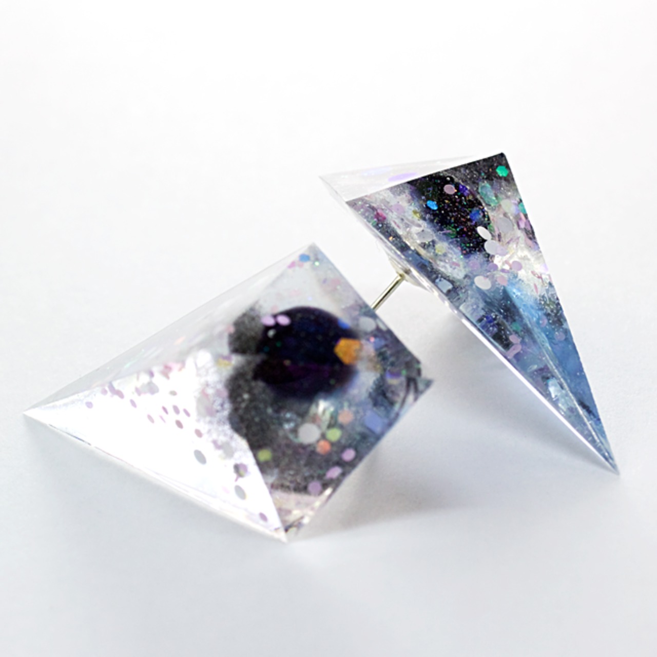 鋭角ピラミッド内にドーム状に偏光ネイビーカラーと細かなラメ、外側に数種類の様々なラメなどをクリスタルレジンで閉じ込めたピラミッドイヤリングです。