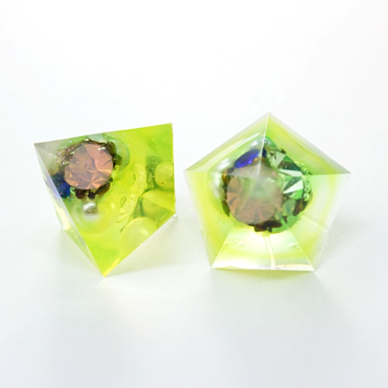 様々なビジューやパールストーン、イエローカラーなどをクリスタルレジンで閉じ込めたペンタゴン型のピアスです。