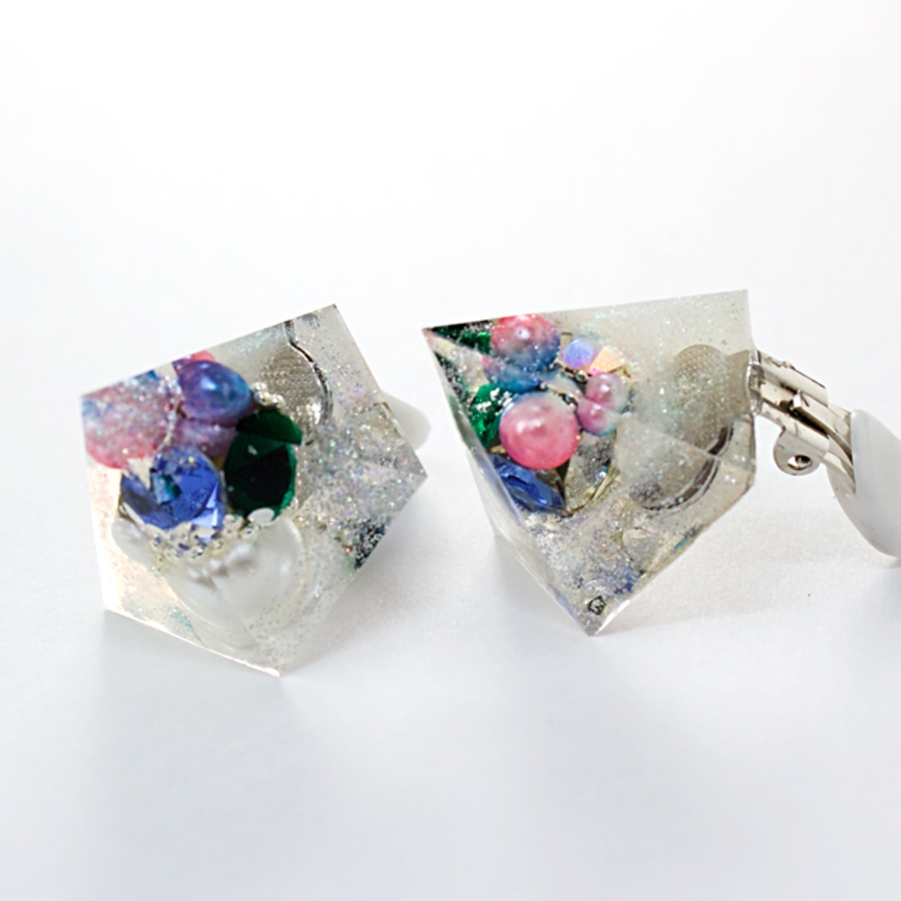 様々なビジューやパールストーン、偏光パウダー、ラメなどをクリスタルレジンで閉じ込めたペンタゴン型のイヤリングです。