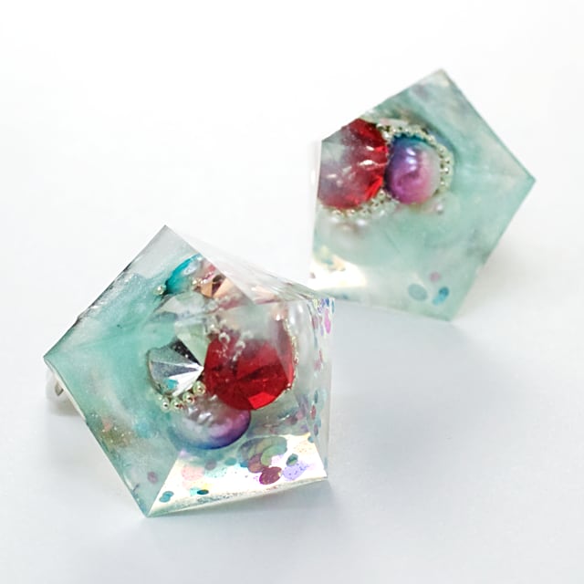 様々なビジューやパールストーン、ライトブルーカラー、偏光パウダーなどをクリスタルレジンで閉じ込めたペンタゴン型のイヤリングです。