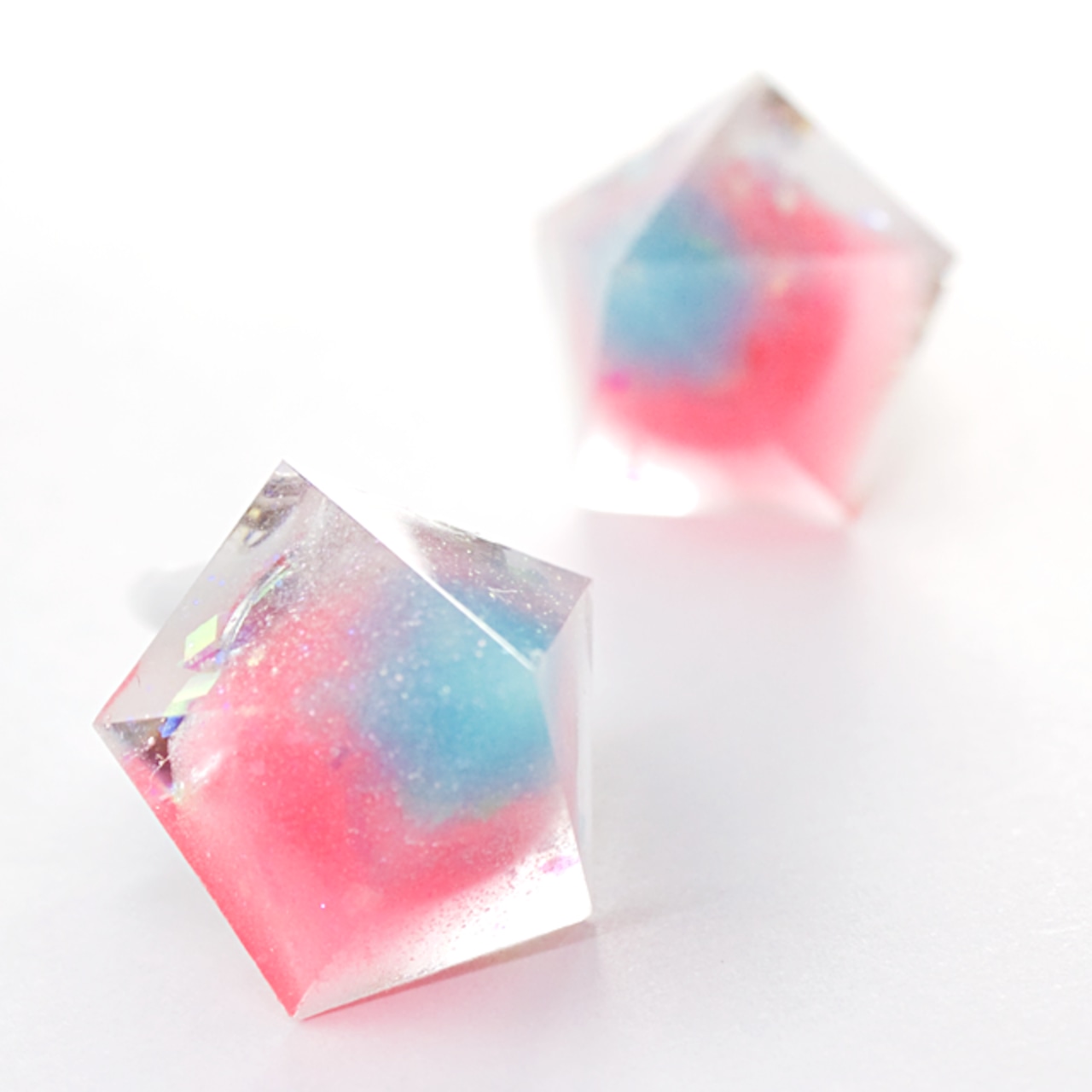 蓄光のピンクとライトブルーカラーを中心にラメなどをクリスタルレジンで閉じ込めたペンタゴン型のイヤリングです。