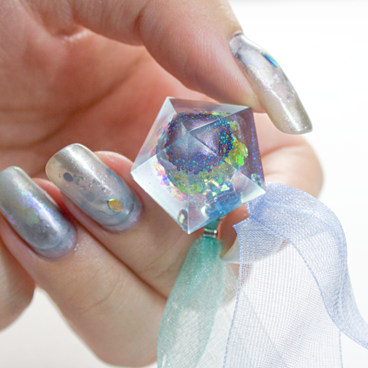 ブルーベースにドーム型にブリオンやラメやパールストーンをクリスタルレジンで閉じ込めたペンタゴン型のイヤリングです。