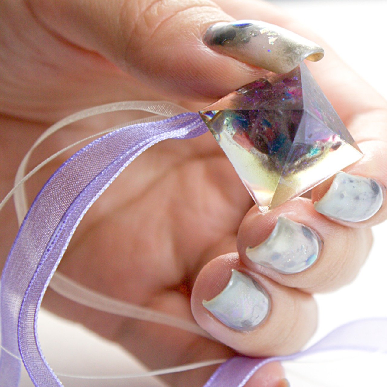 ピラミッド内にイエローのカラーや、カラフルな丸ラメ、偏光パウダーなどをクリスタルレジンで閉じ込めたピラミッドイヤリングです。