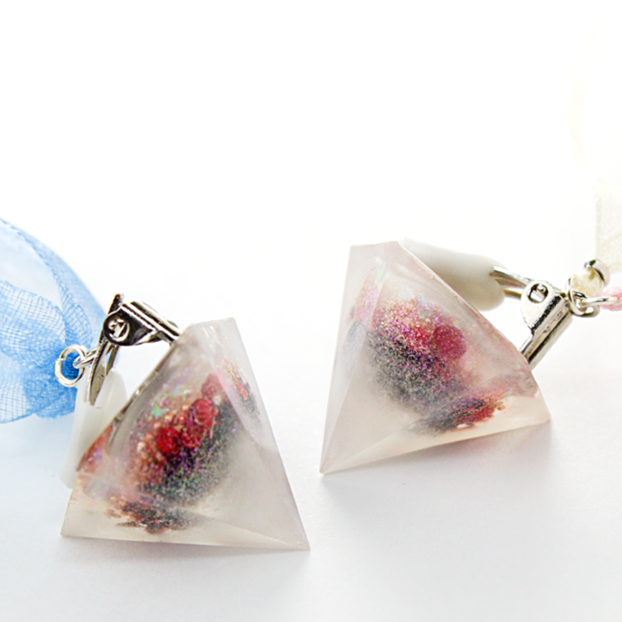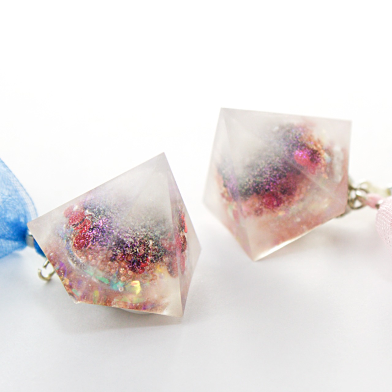 ドーム型にブリオンやラメや、などを封じ込め、さらにピンクっぽいホワイトのクリスタルレジンでペンタゴン型に閉じ込めたイヤリングです。