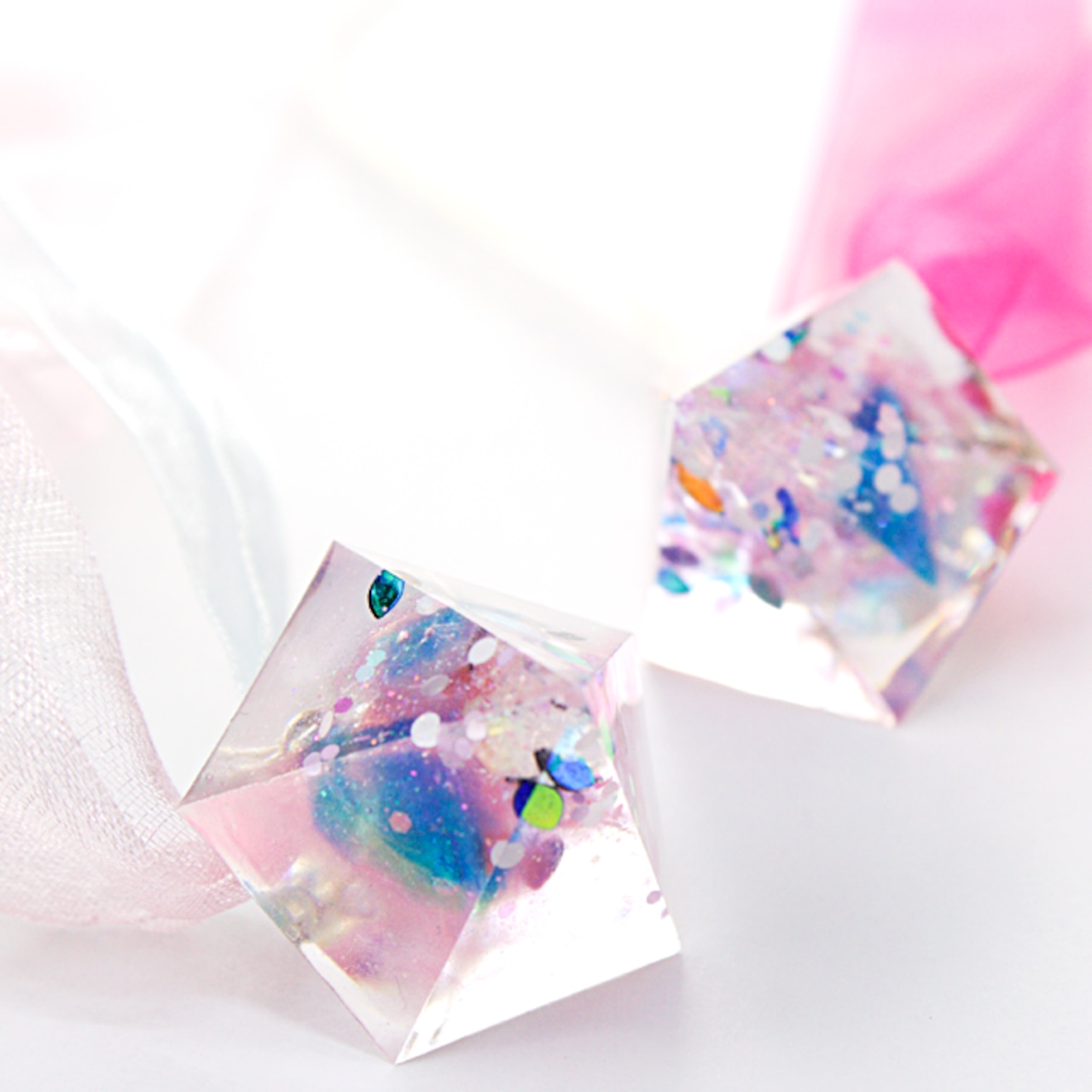 様々なラメやカラーの破片などを封じ込め、クリアカラーにピンクカラーをクリスタルレジンでペンタゴン型に閉じ込めたピアスです。ポストはsv925を使用しています。