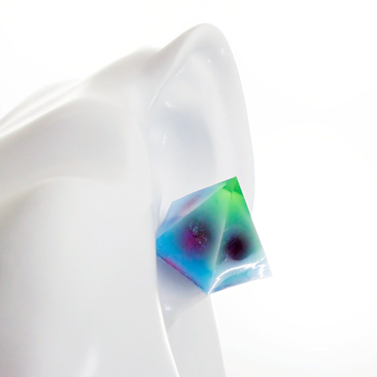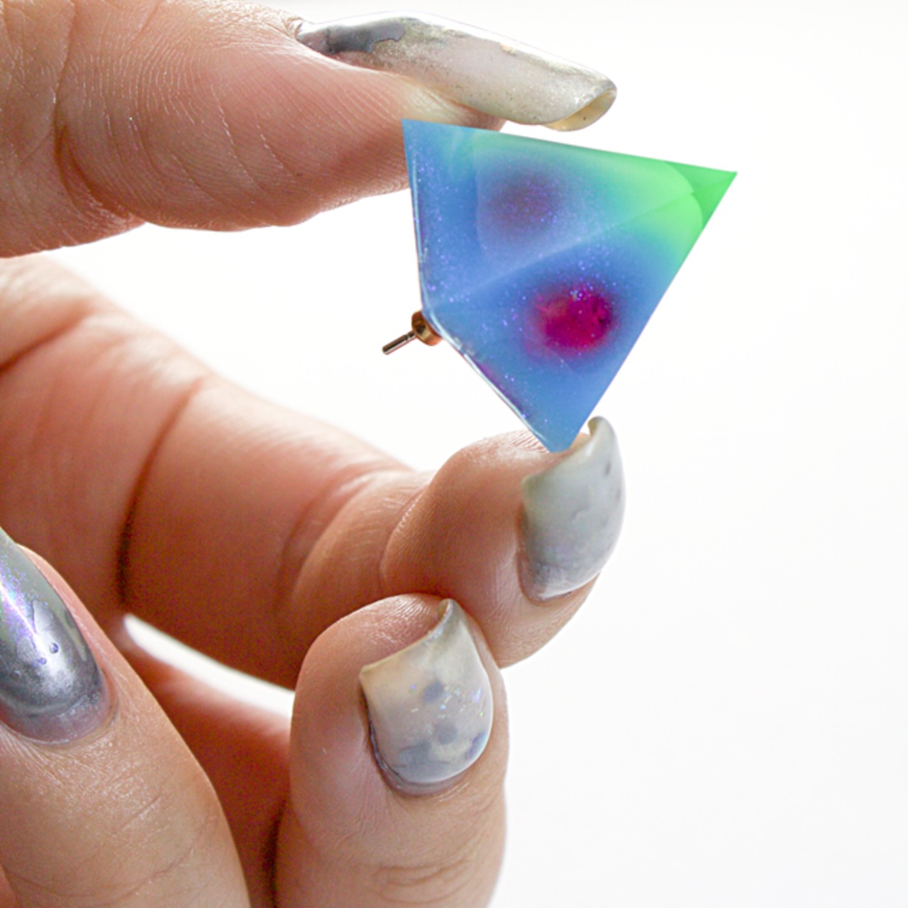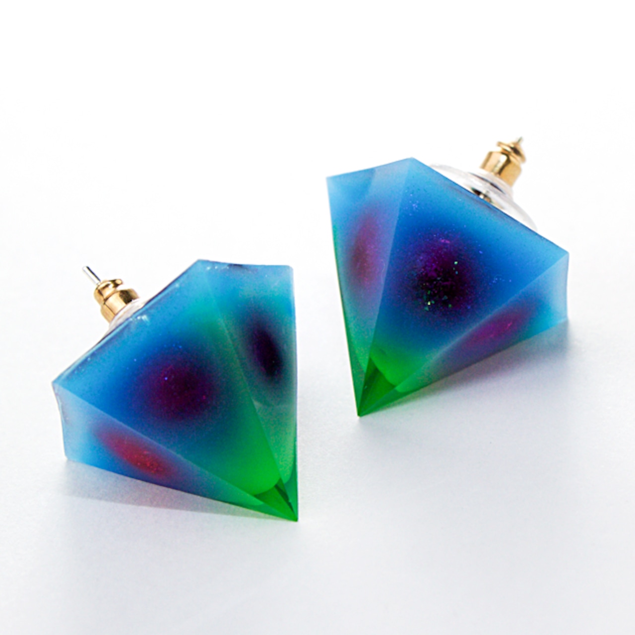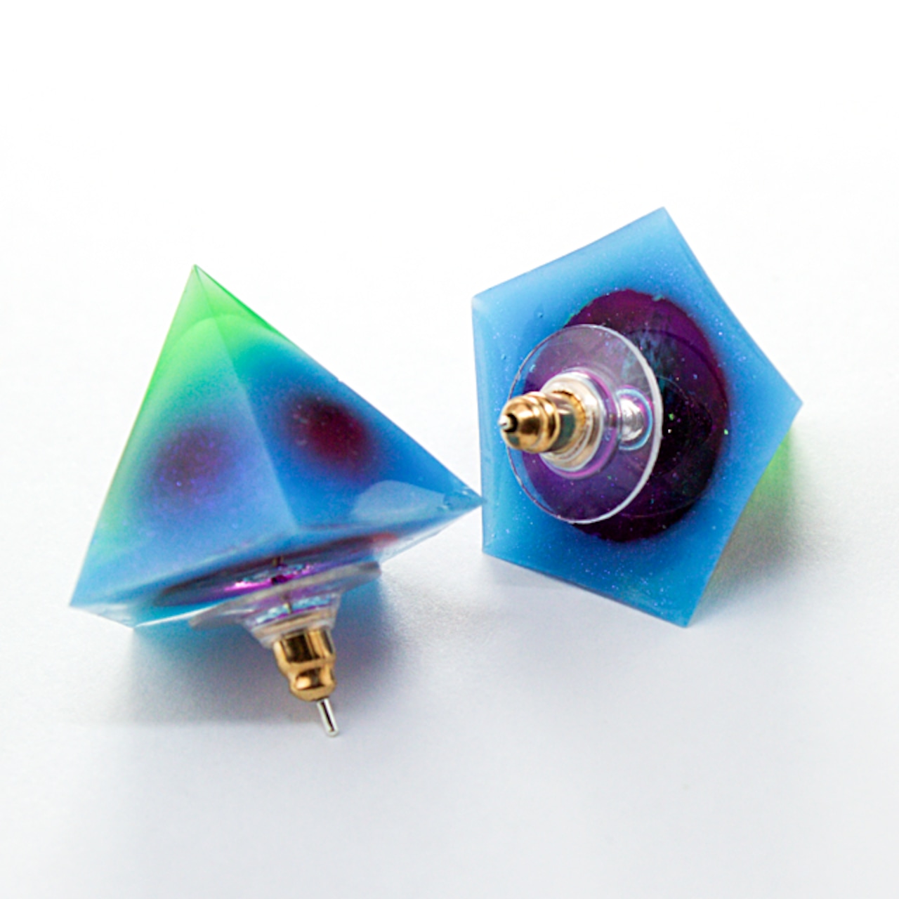 レッドの顔料をドーム型に、そしてグリーン、ブルーの顔料をペンタゴン型にクリスタルレジンで閉じ込めたピアスです。
