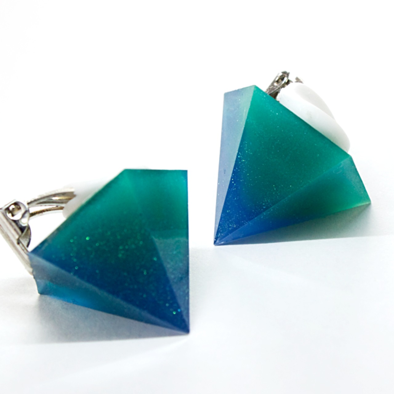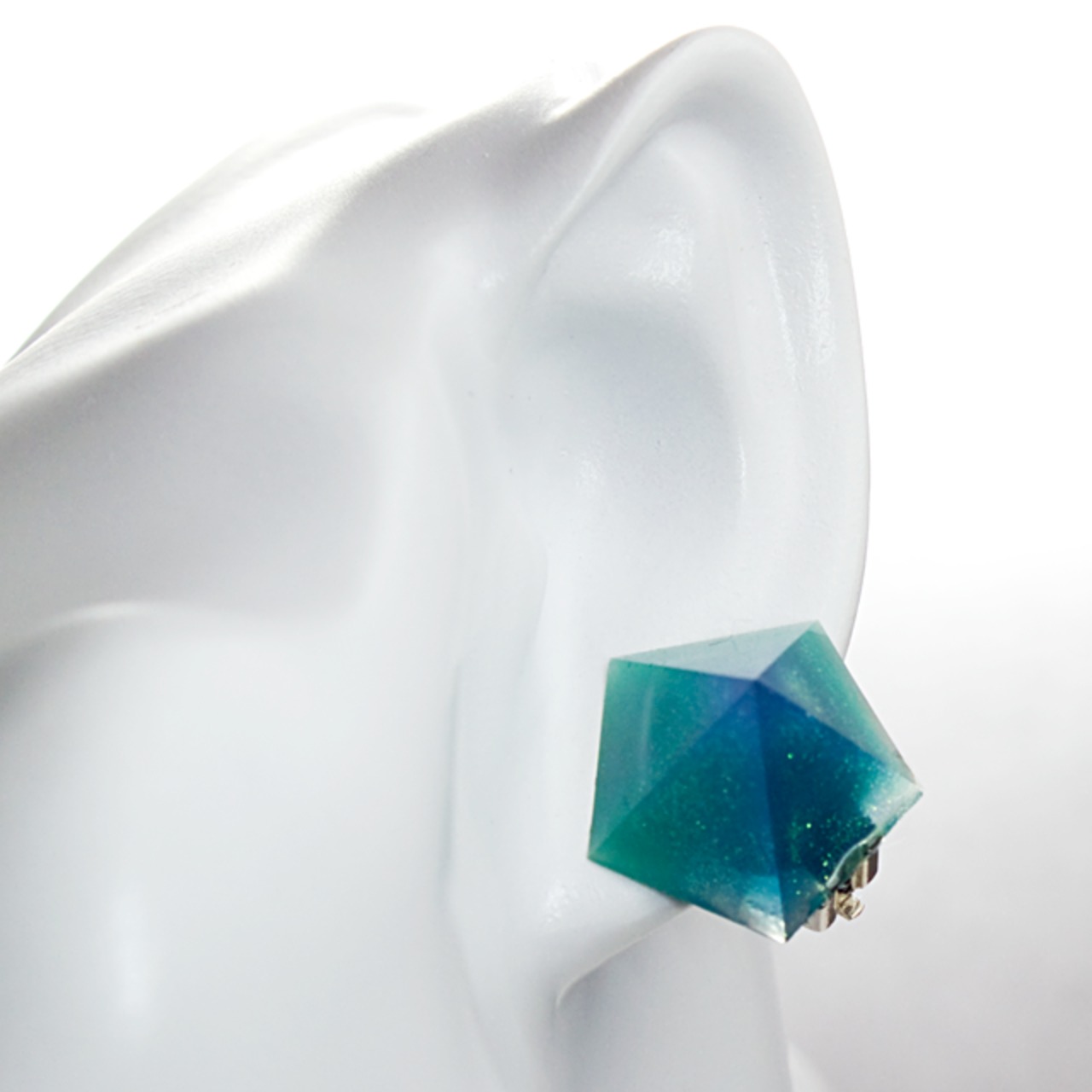 温度で色の変わるカラーと数種類のラメなどをクリスタルレジンで閉じ込めたペンタゴンサーモイヤリングです。