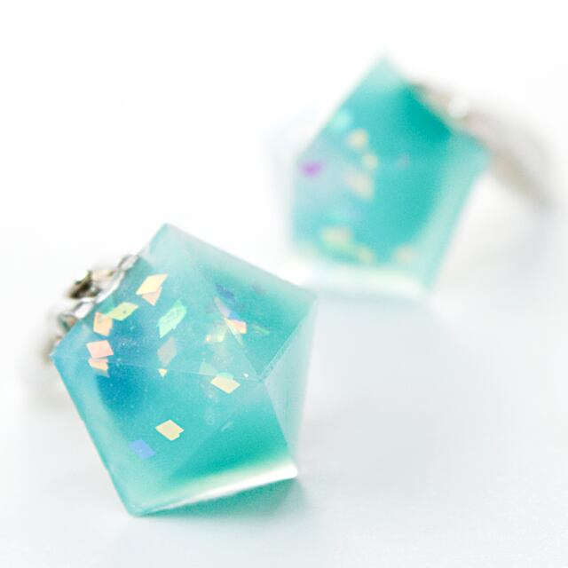 温度で色の変わるカラーと数種類のラメなどをクリスタルレジンで閉じ込めたペンタゴンサーモイヤリングです。