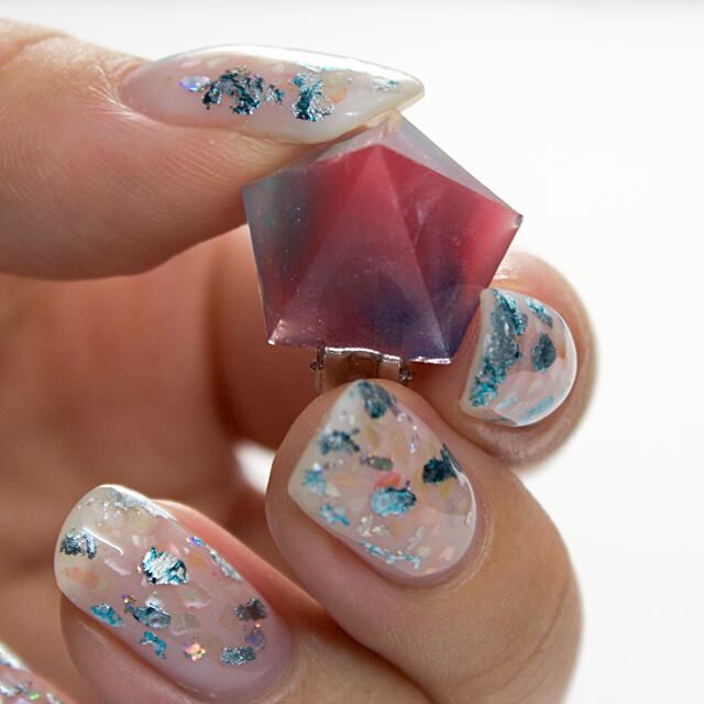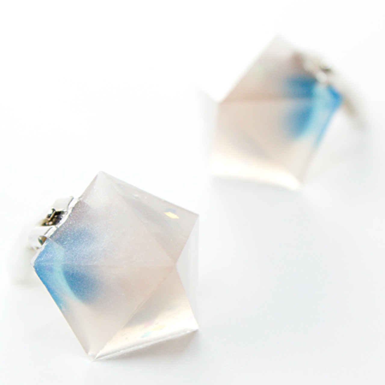 温度で色の変わるカラーと数種類のラメなどをクリスタルレジンで閉じ込めたペンタゴンサーモイヤリングです。