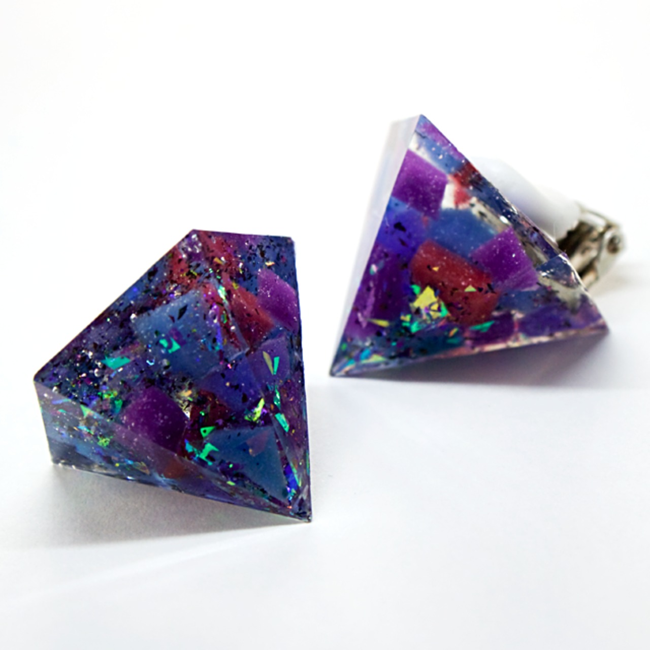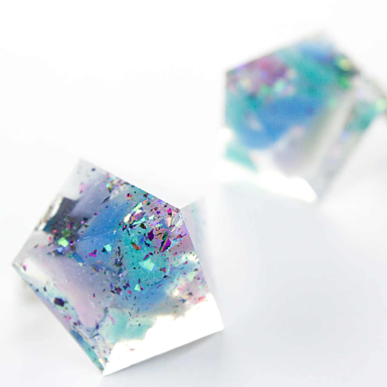 温度で色の変わるカラーを固めたものを砕いてクリスタルレジンで閉じ込めたペンタゴンサーモイヤリングです。