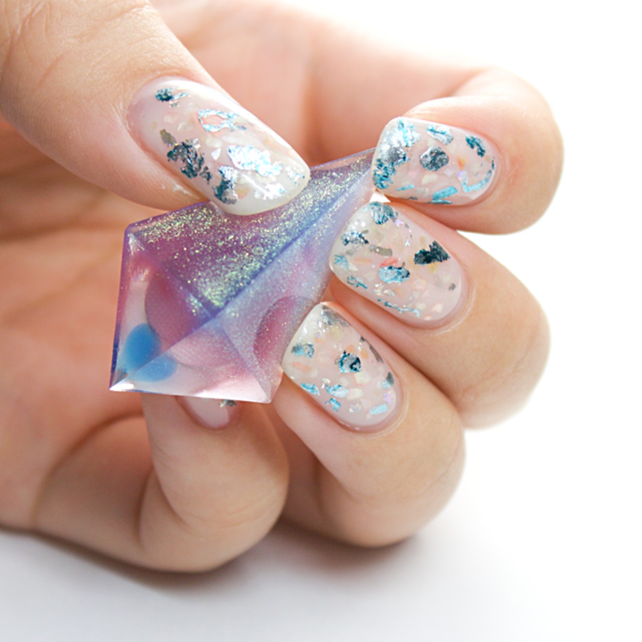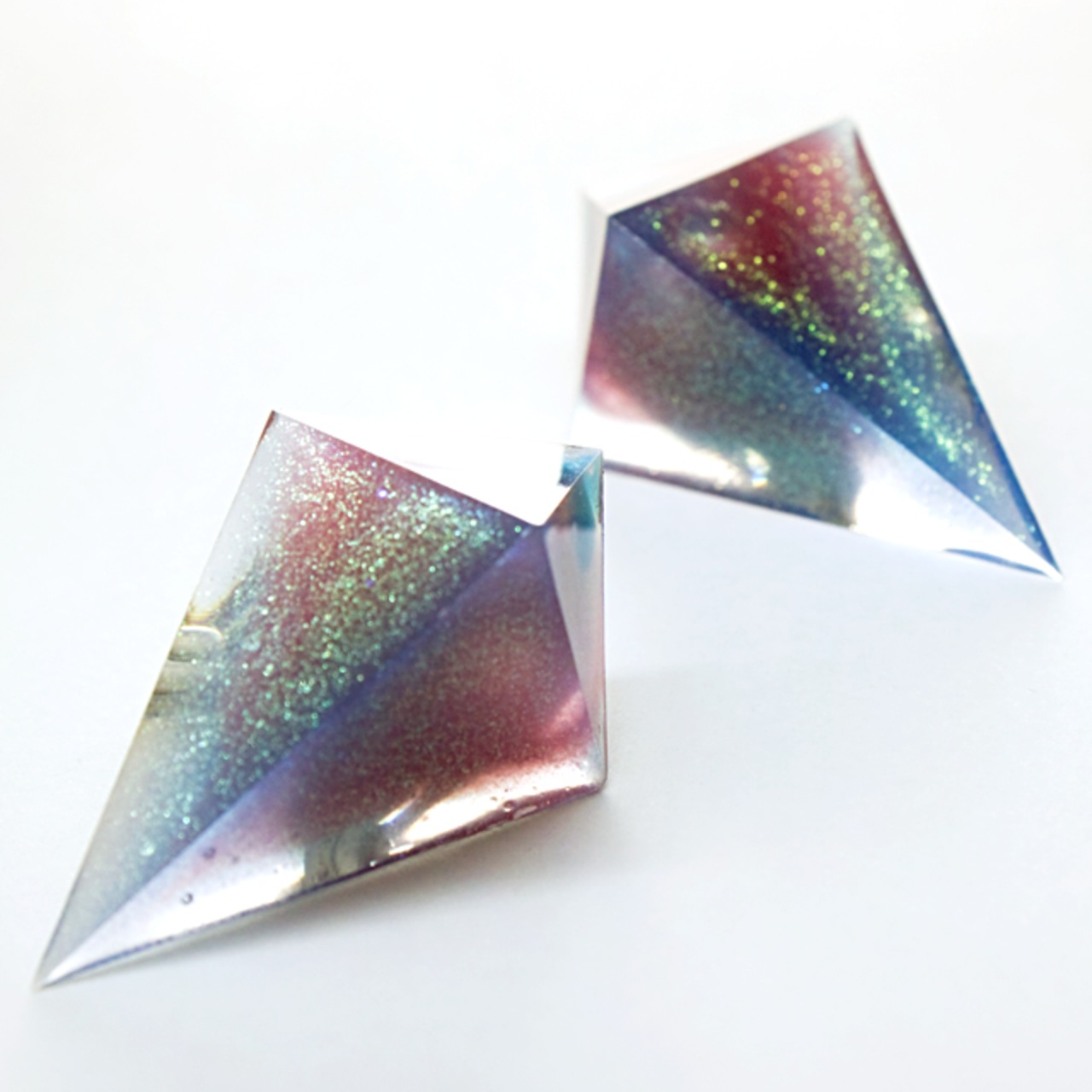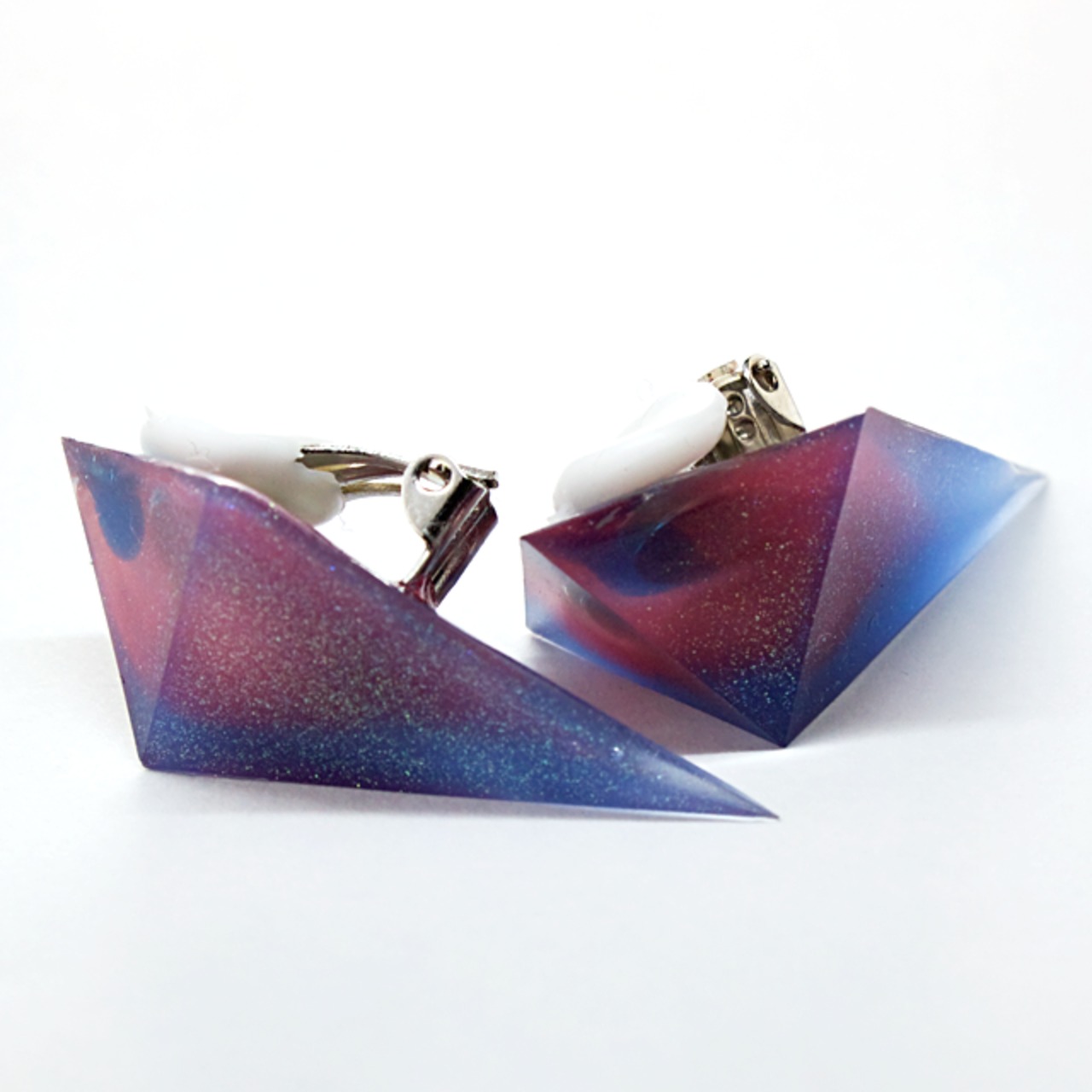 温度で色の変わるカラーと、一部分変わらないカラーをクリスタルレジンで閉じ込めた鋭角ピラミッドイヤリングです。