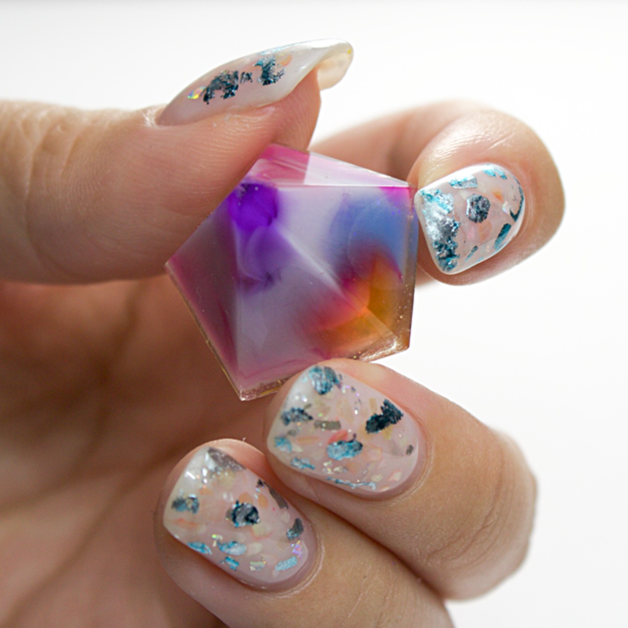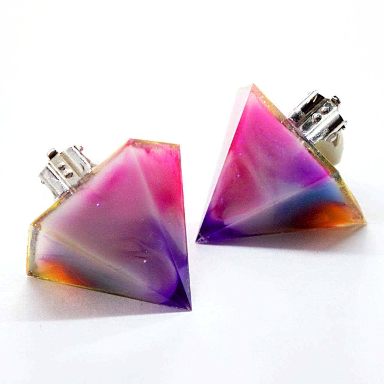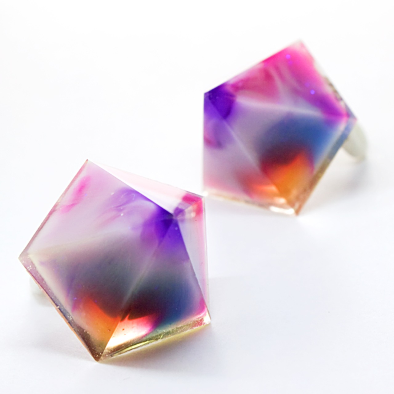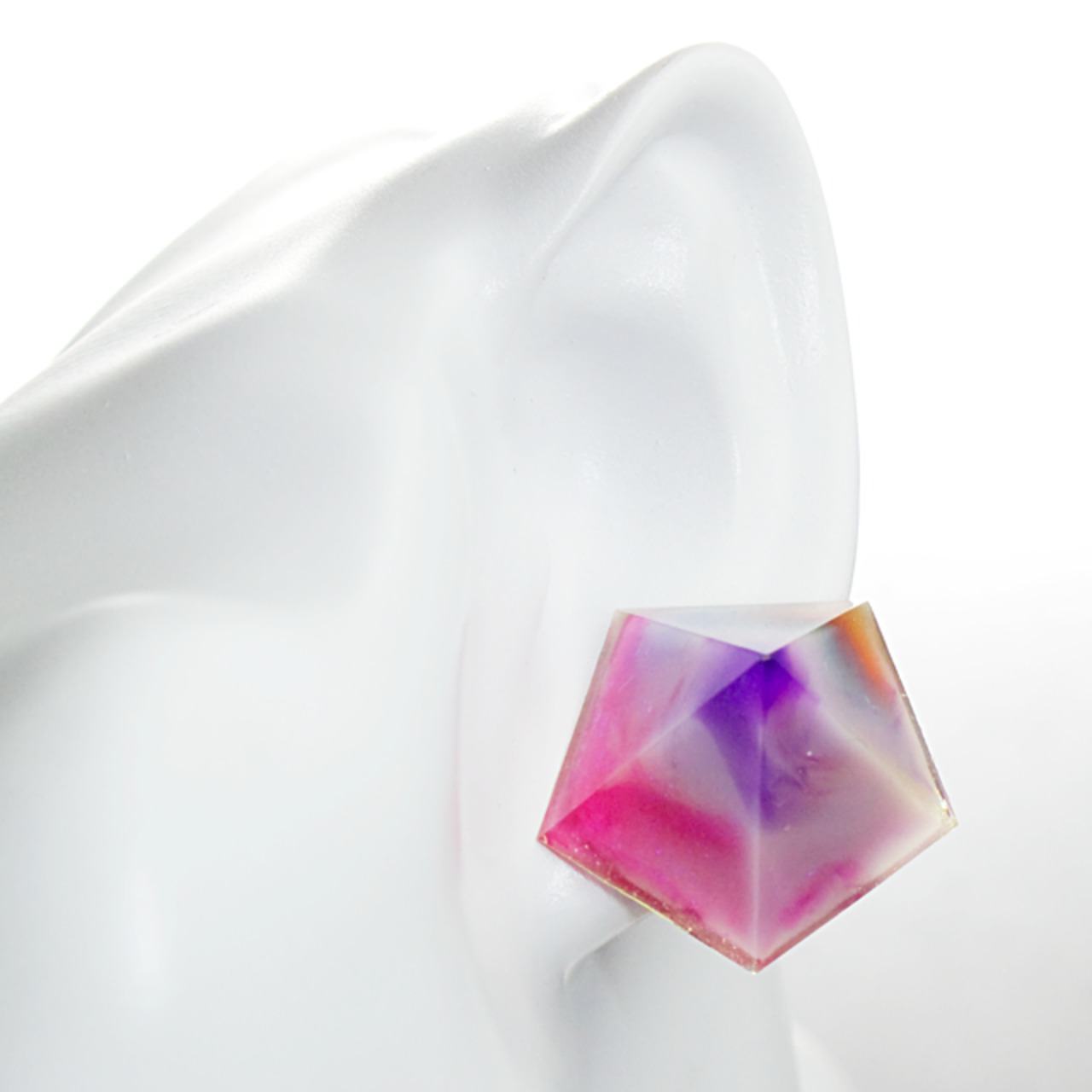 様々なカラーをクリスタルレジンで閉じ込めたペンタゴン型のイヤリングです。