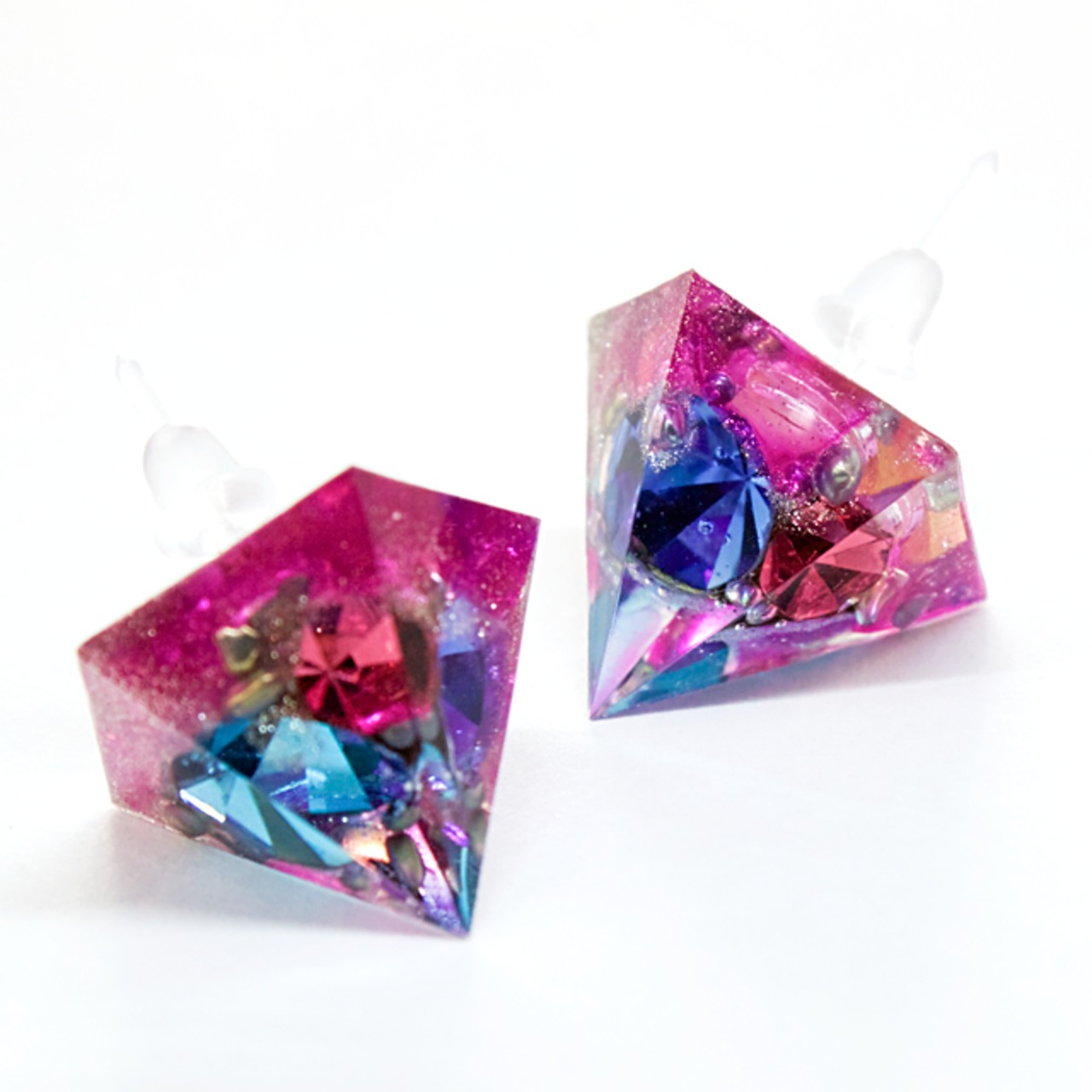 様々なビジューやストーン、ピンクパープルカラーなどをクリスタルレジンで閉じ込めたペンタゴン型のピアスです。