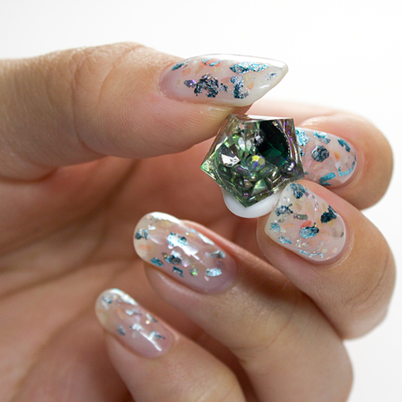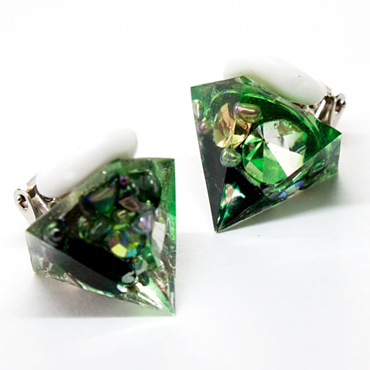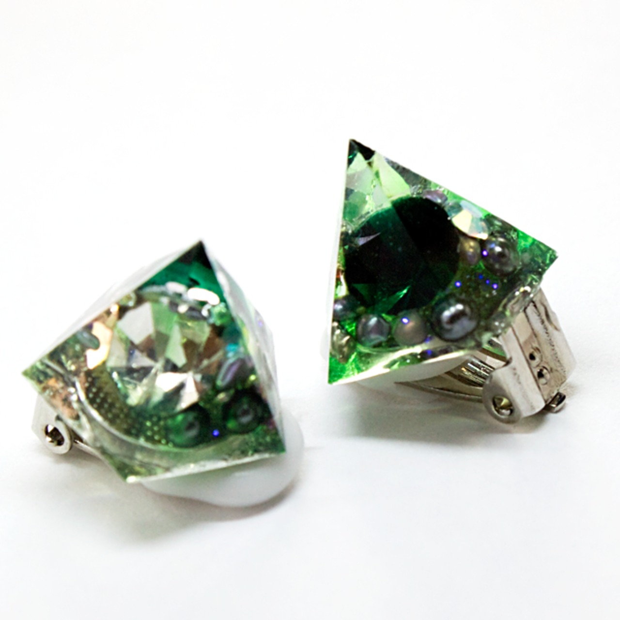 様々なビジューやストーン、グリーンカラーなどをクリスタルレジンで閉じ込めたペンタゴン型のイヤリングです。