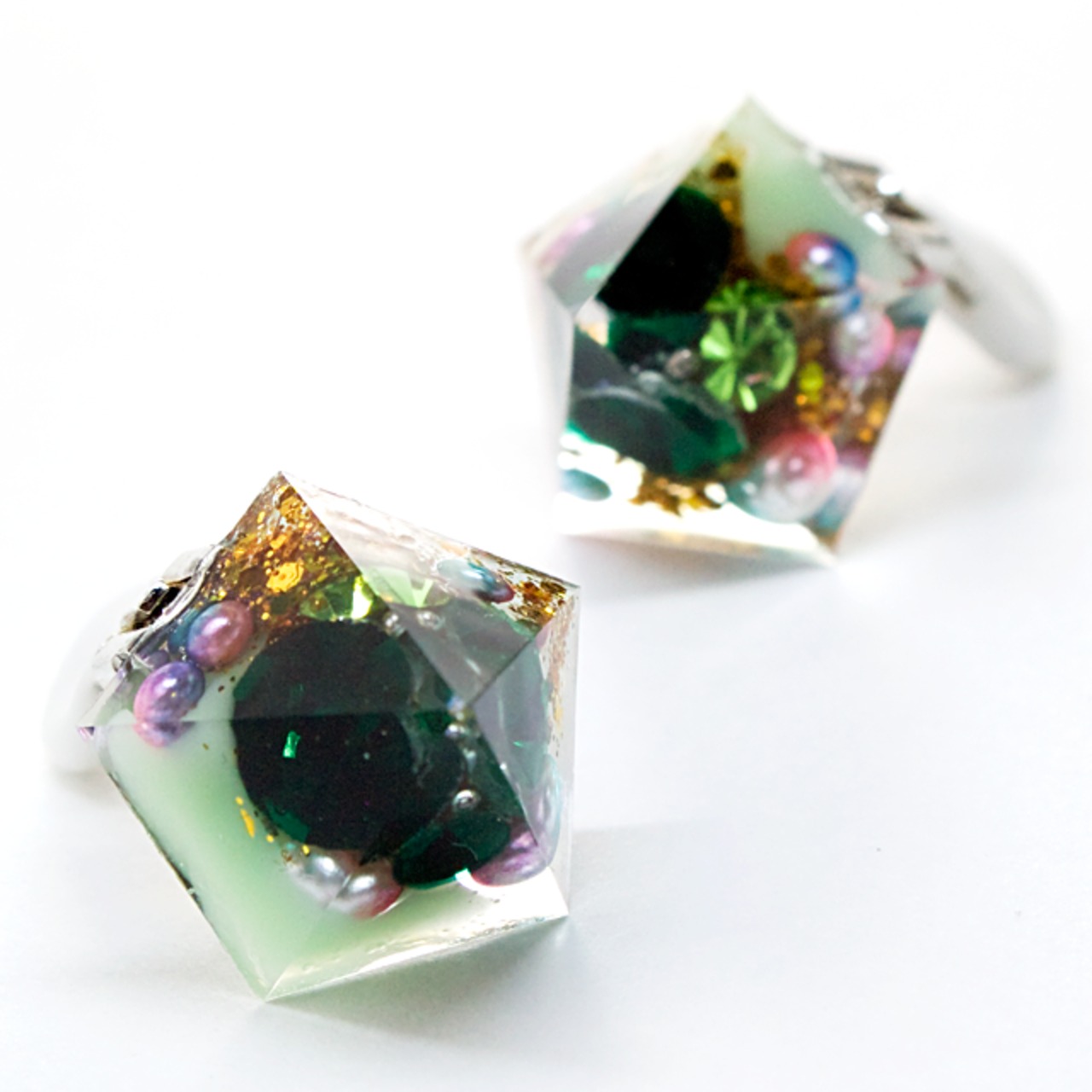グリーンの様々なサイズのビジューやグラデーションパールストーン、ミントカラーなどをクリスタルレジンで閉じ込めたペンタゴン型のイヤリングです。