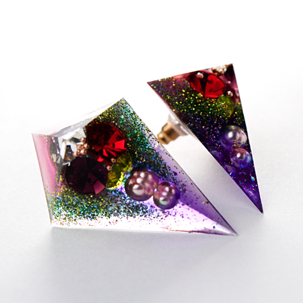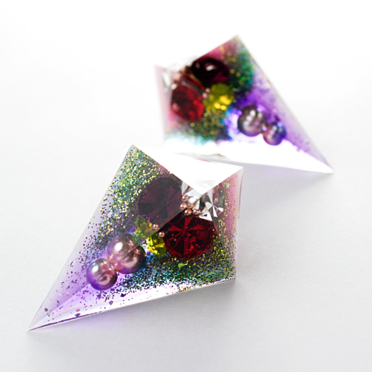ピンク、アーミーグリーン、パープルのカラーを始め、ビジューやパールストーン、メタリックなボール、ラメなどを盛り沢山クリスタルレジンで閉じ込めた鋭角ピラミッドピアスです。