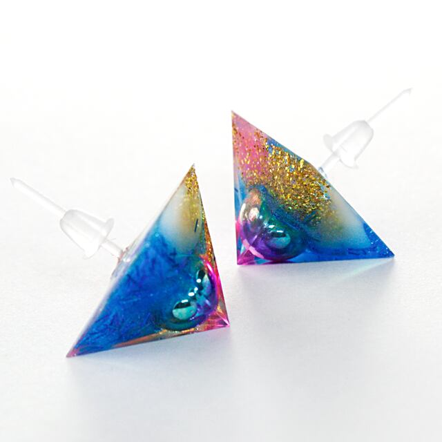 ホワイト、ピンクカラーを中心にブルーやゴールドのラメ、輝くストーンなどをクリスタルレジンで閉じ込めたピラミッド型のピアスです。