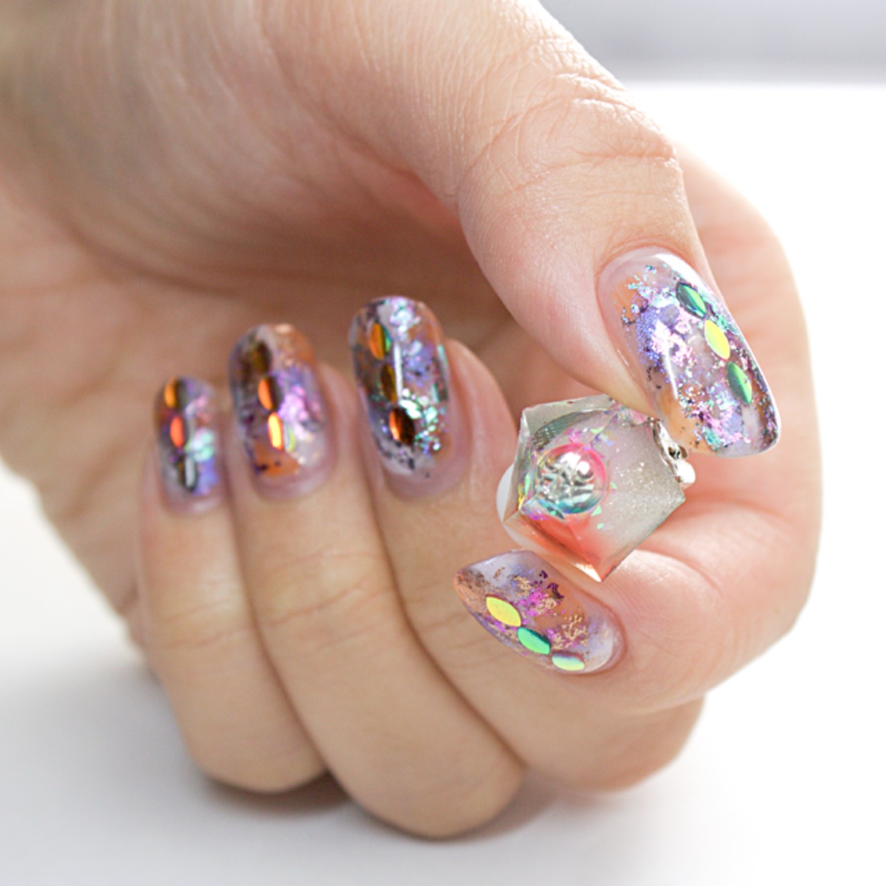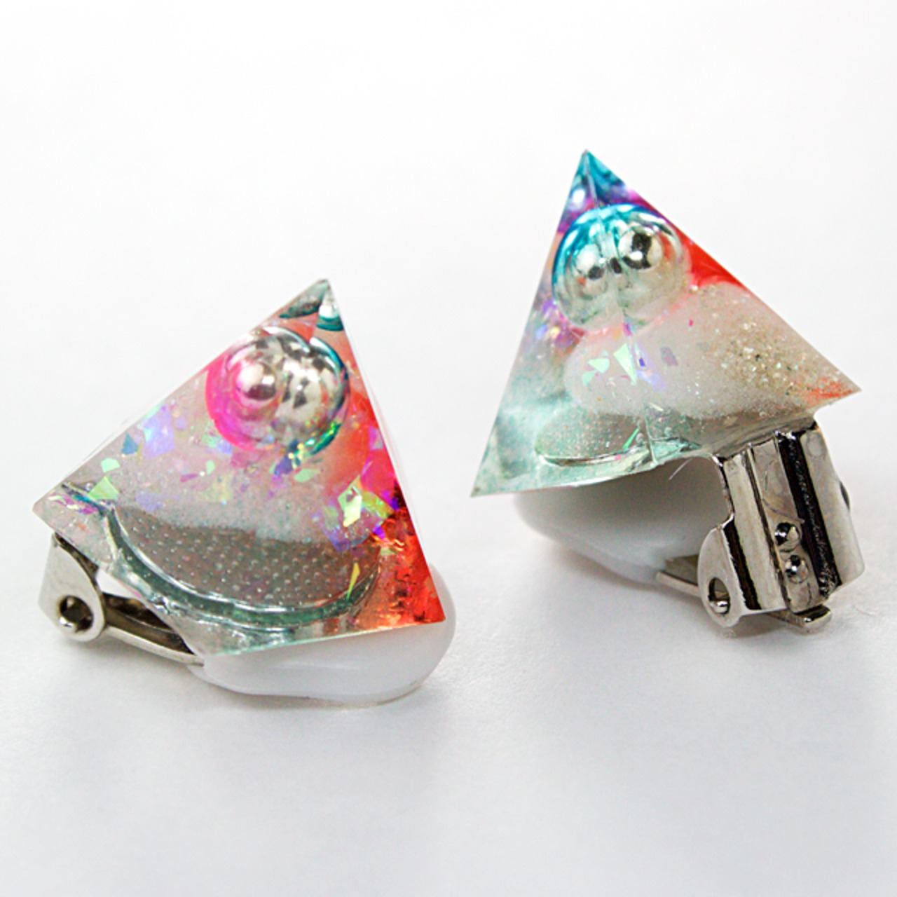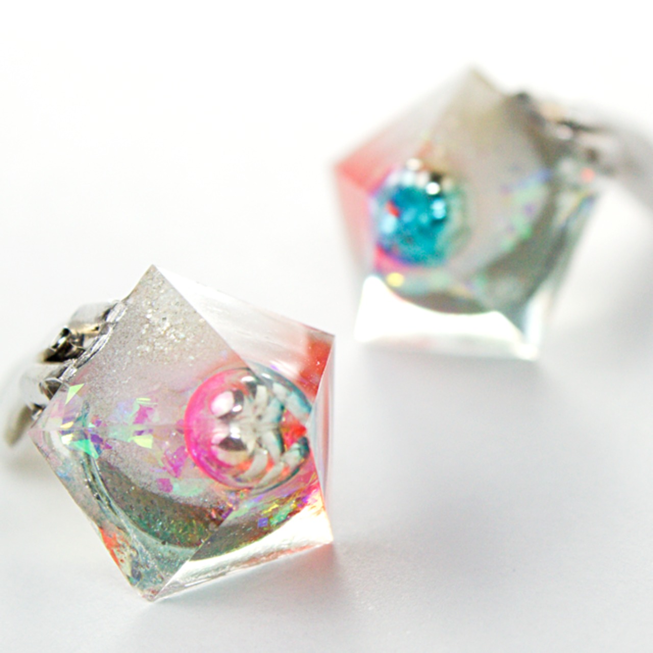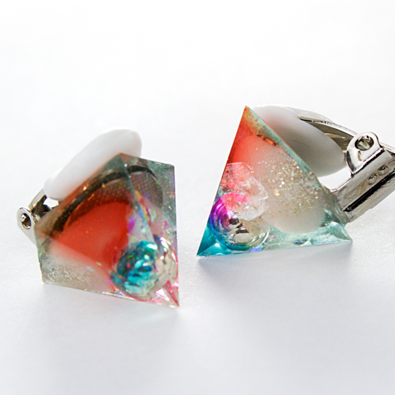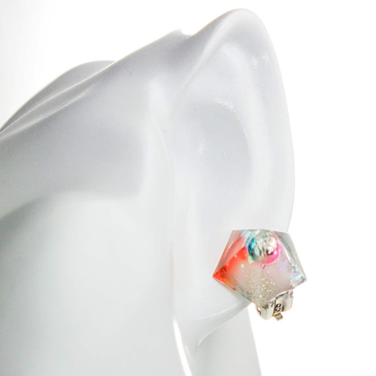 オレンジ、ホワイトカラー、ラメ、輝く玉などをクリスタルレジンで閉じ込めたペンタゴン型のイヤリングです。