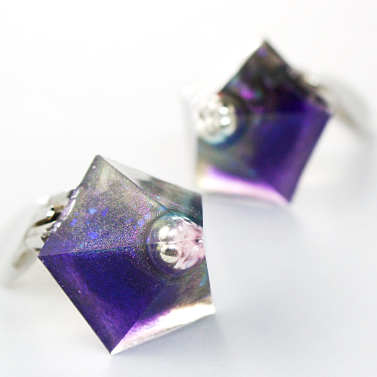 パープル、ブルー、ブラックカラー、輝く玉などをクリスタルレジンで閉じ込めたペンタゴン型のイヤリングです。