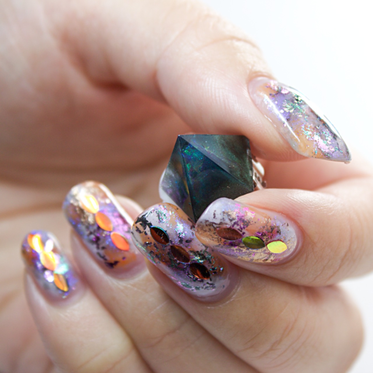 グリーン、ダークグリーンカラー、ラメ、自作パーツなどをクリスタルレジンで閉じ込めたペンタゴン型のイヤリングです。