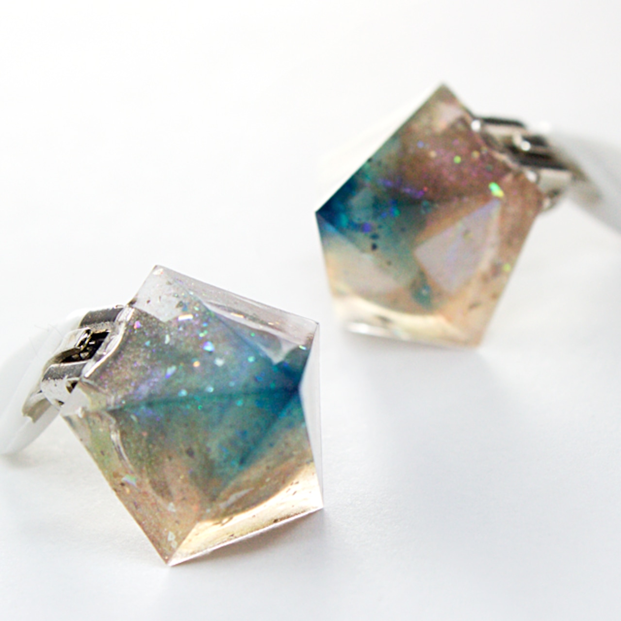 ブルー、ラメ、自作パーツなどをクリスタルレジンで閉じ込めたペンタゴン型のイヤリングです。