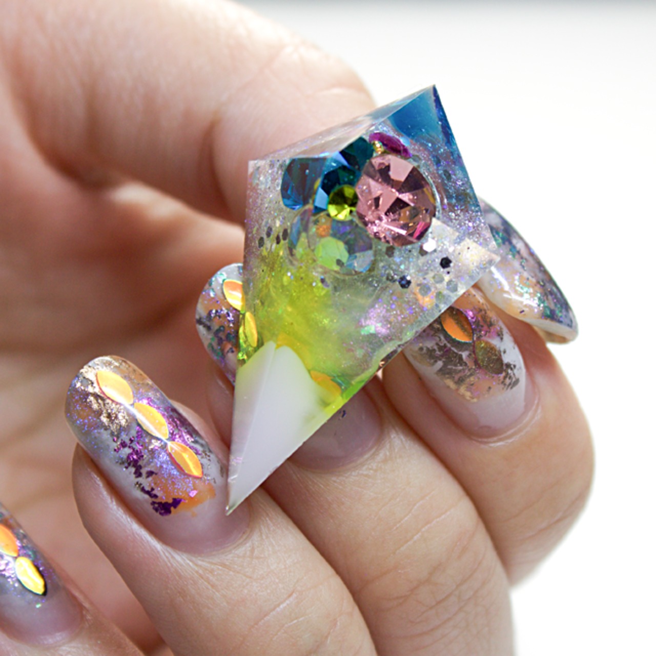 ブルー、イエロー、ホワイトカラー、ビジューやパールストーンなどを盛り沢山クリスタルレジンで閉じ込めた鋭角ピラミッドイヤリングです。