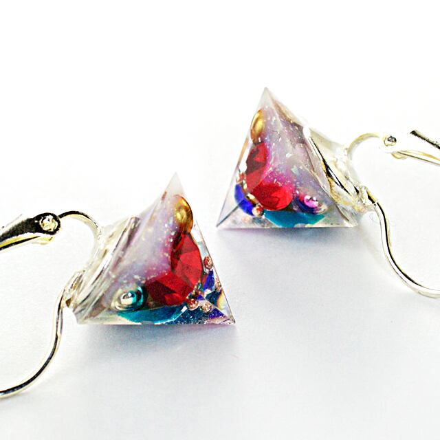 様々なビジューやパールストーン、ホワイトカラーなどをクリスタルレジンで閉じ込めたペンタゴン型のフックピアスです。